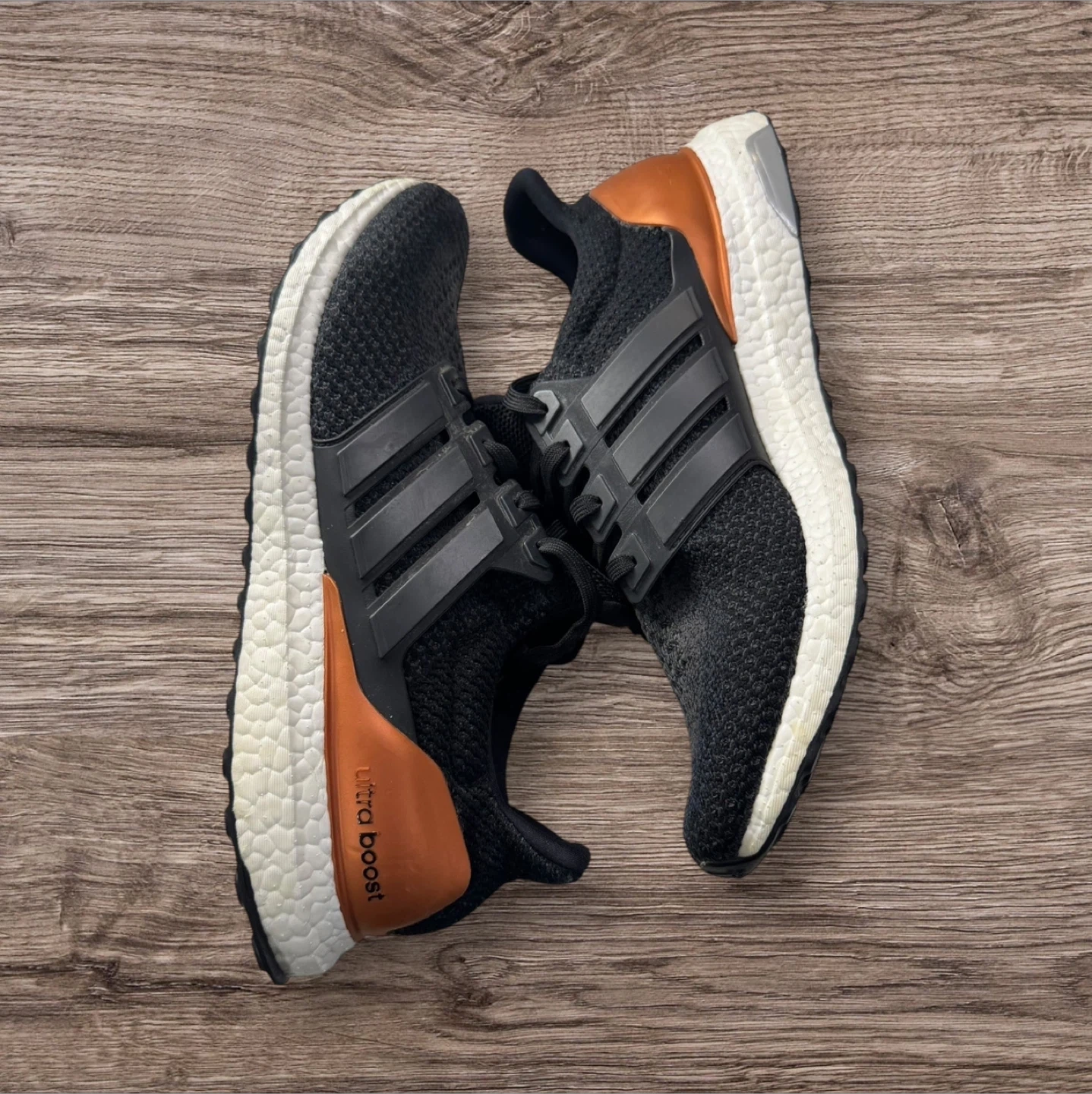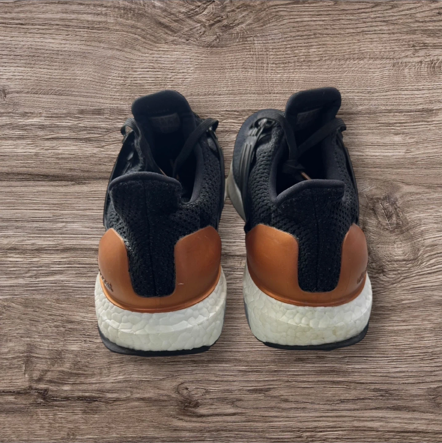 Selling a pair of Adidas Ultra Boost running shoes in a sleek black and bronze colourway! These shoes are in great shape and ready for your next run or casual wear. They offer a comfortable fit and stylish design. Perfect for hitting the pavement or just kicking around town!