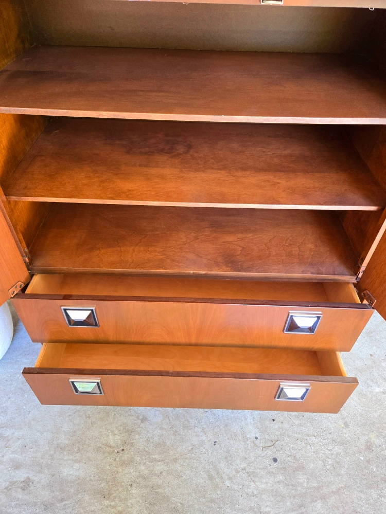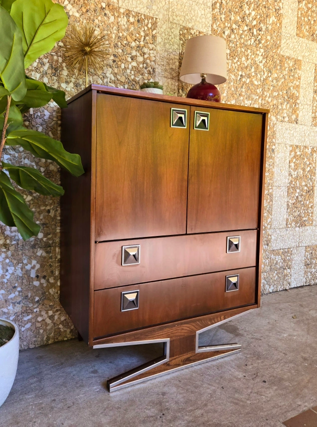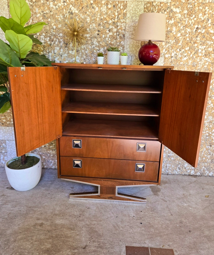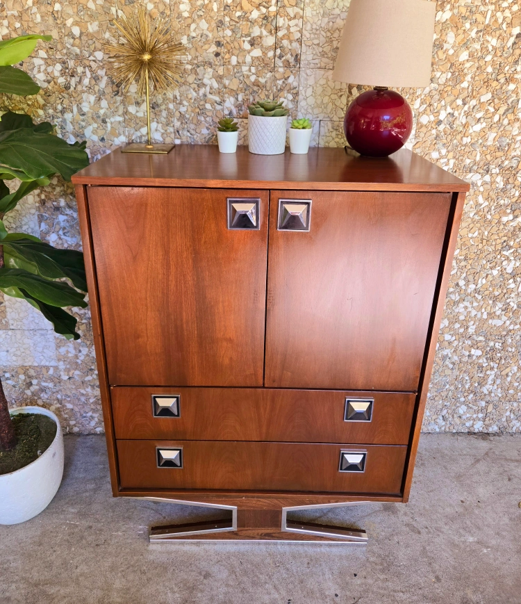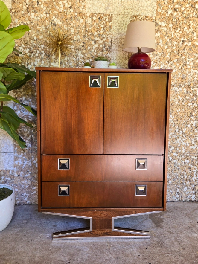 Art Deco Walnut Tall Boy Dresser With Silver Chrome Accents Here's a cool mid-century modern Armoire dresser and nightstand set! The set has a beautiful walnut veneer finish and unique chrome details. It would be a great addition to any bedroom or living space looking for a vintage touch. Nightstand available for $235 or take both for $850 Dimensions: Armoire- 34w x 18.25d x 45.5h Nightstand- 23.25w x 14d x 24h Pick up in downtown Vancouver or delivery may be arranged for a reasonable fee. Priority is given to those who are able to pick up. Tags: retro vintage antique burl wood rosewood walnut brass gold copper 1920s 1930s 1940s sideboard credenza buffet server Hutch cabinet tv bench hallway table console table entertainment unit living room dining room mcm mid century modern furniture retro vintage vinyl teak 1950s 1960s 1970s sixties tall boy tallboy cb2 eq3 west elm rental staging film tv Bedroom chest of drawers dresser rental