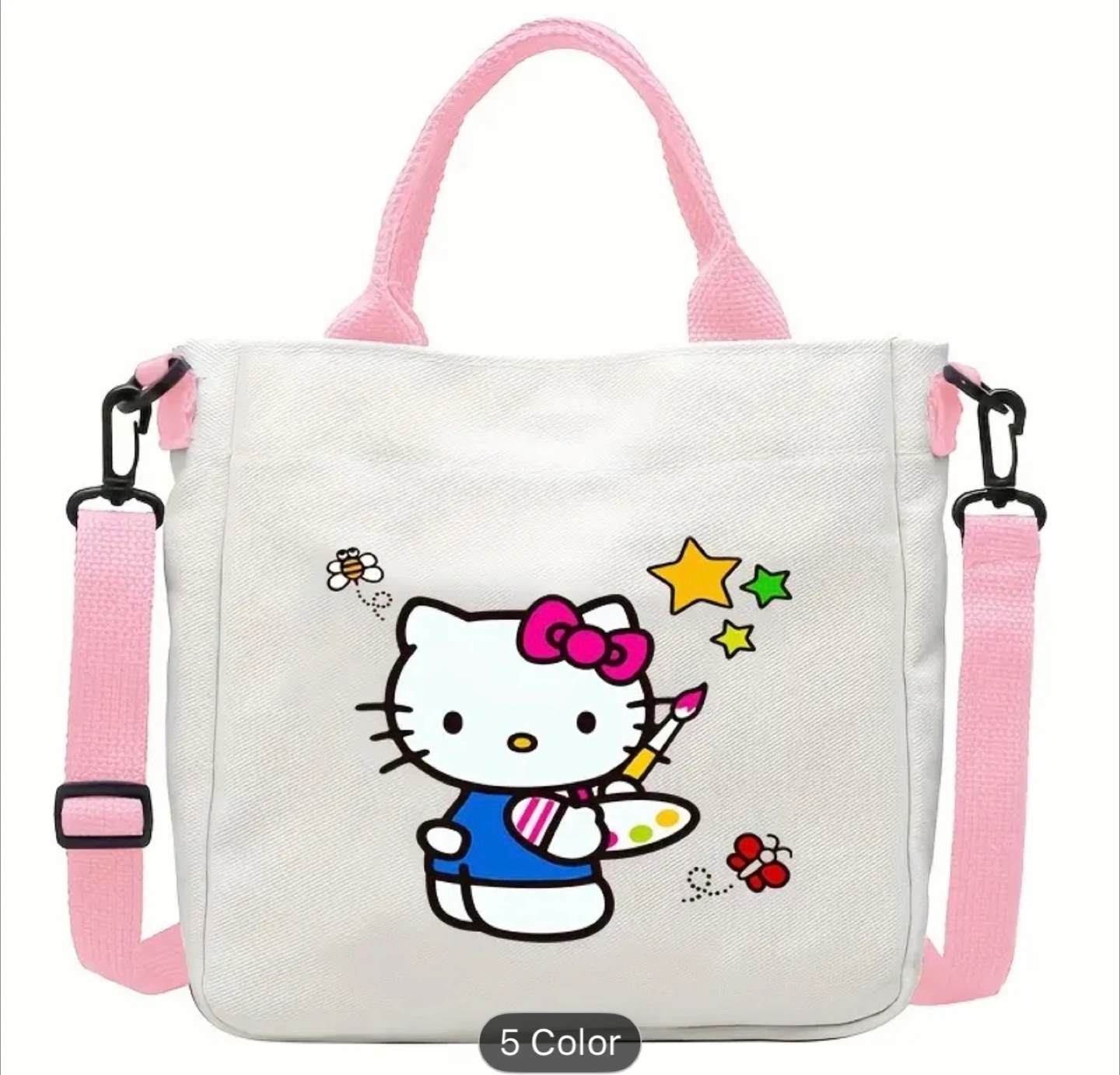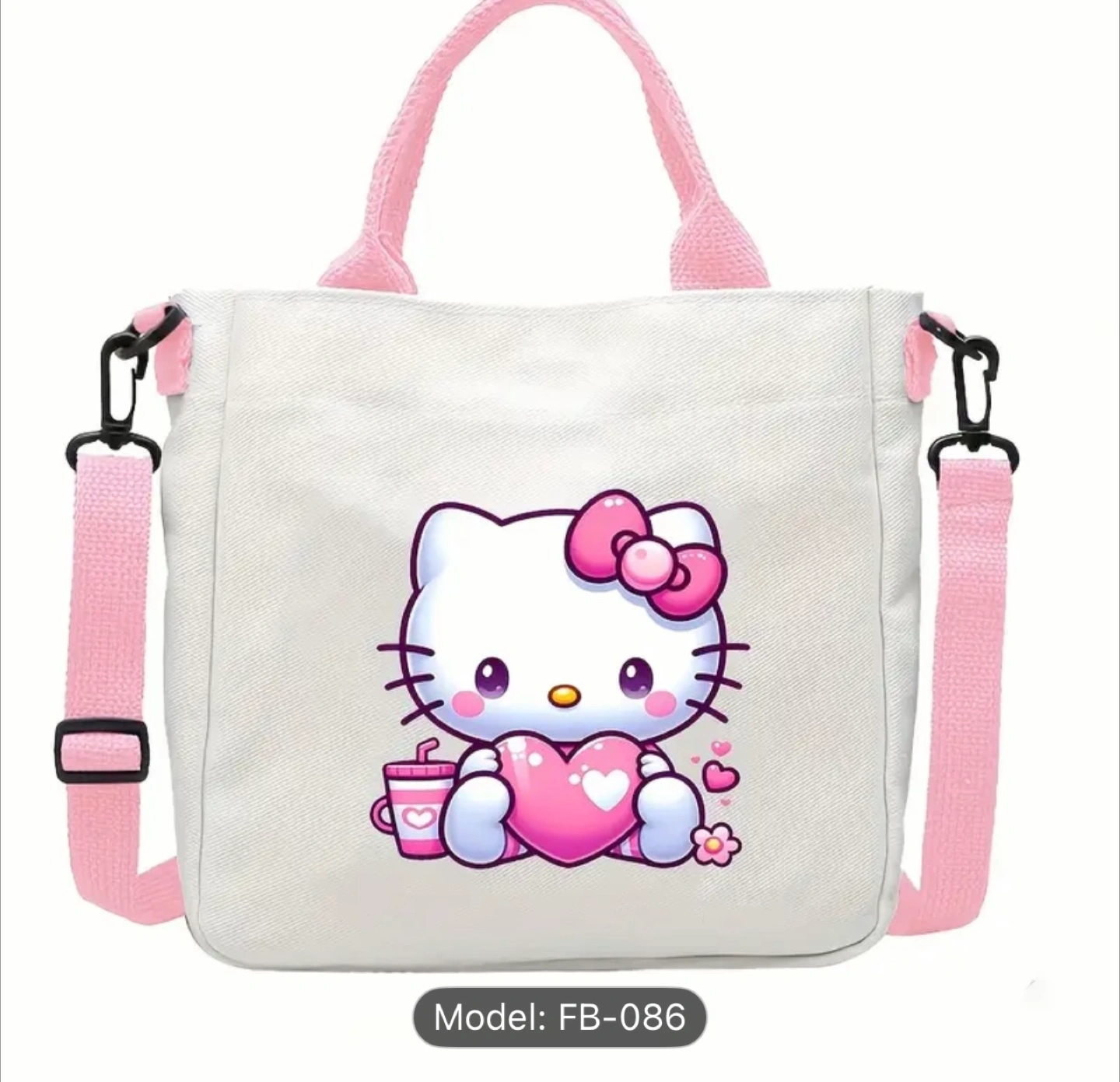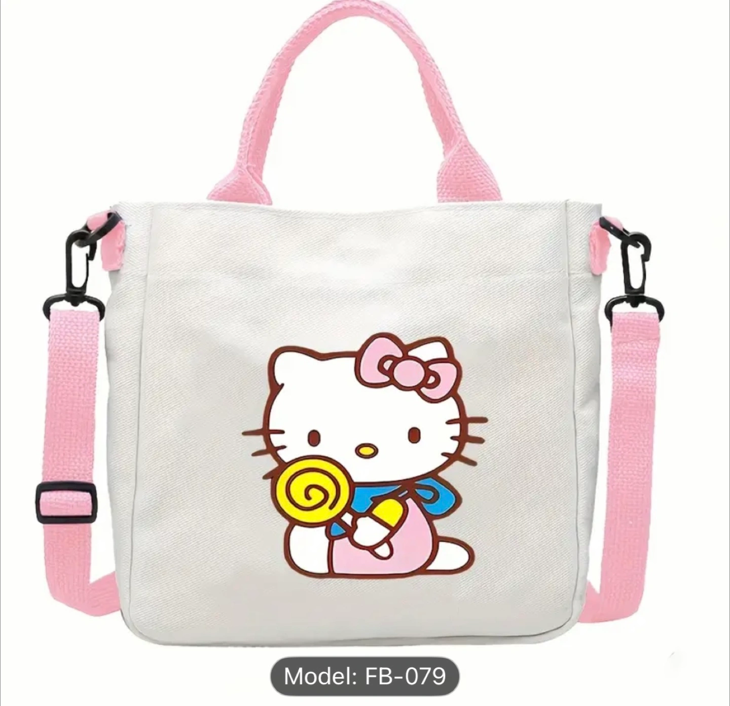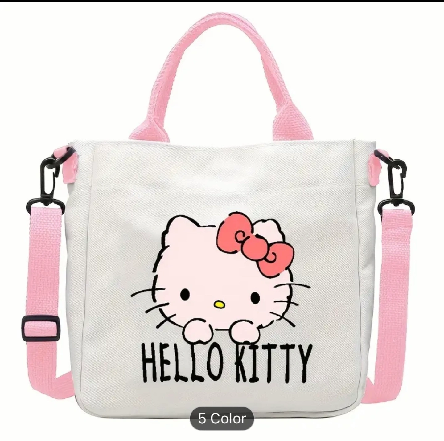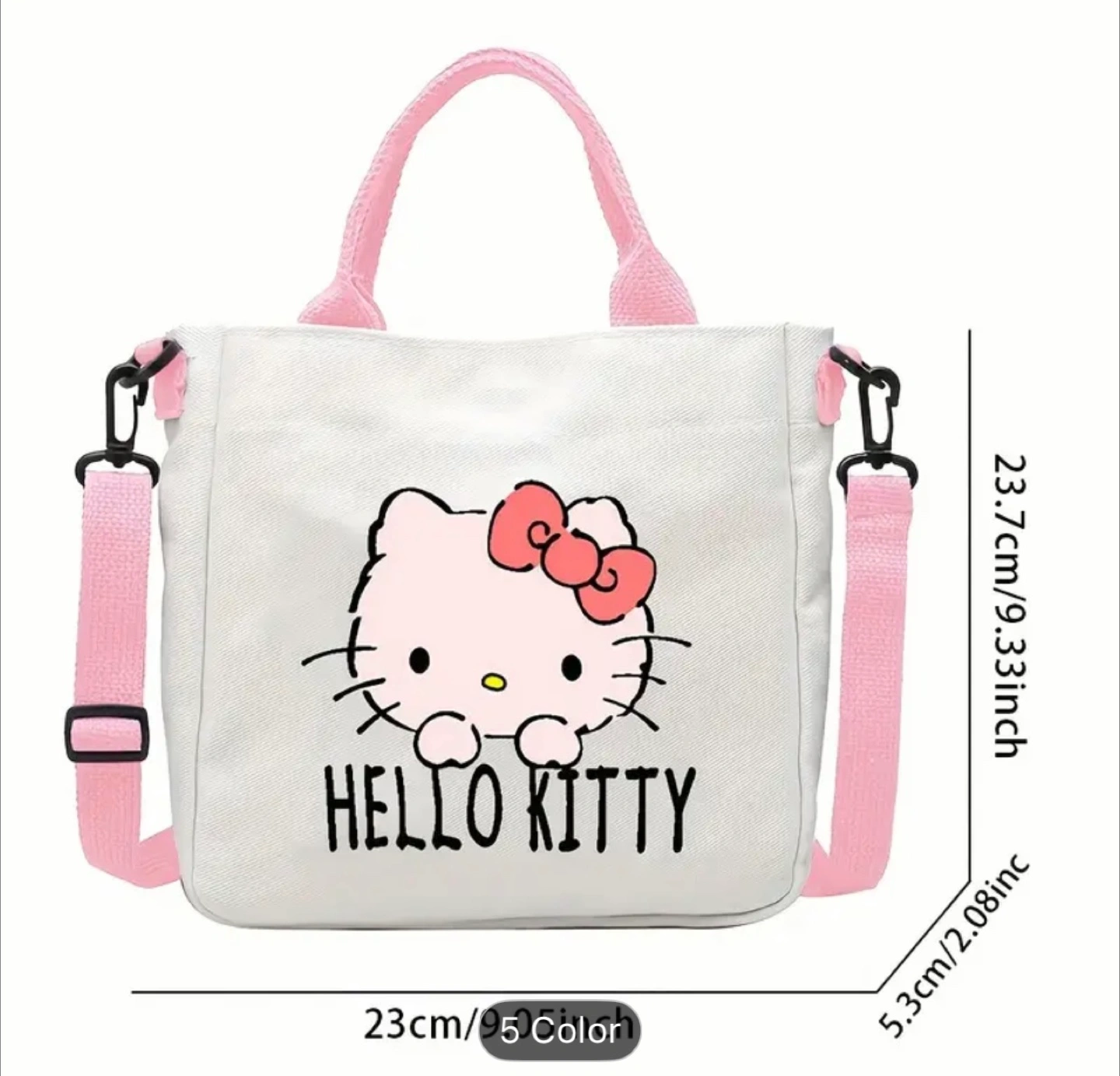 Super cute Hello Kitty tote bag! It's white with pink accents and features various Hello Kitty designs. The bag measures approximately 23cm x 23.7cm. Perfect for carrying your everyday essentials!