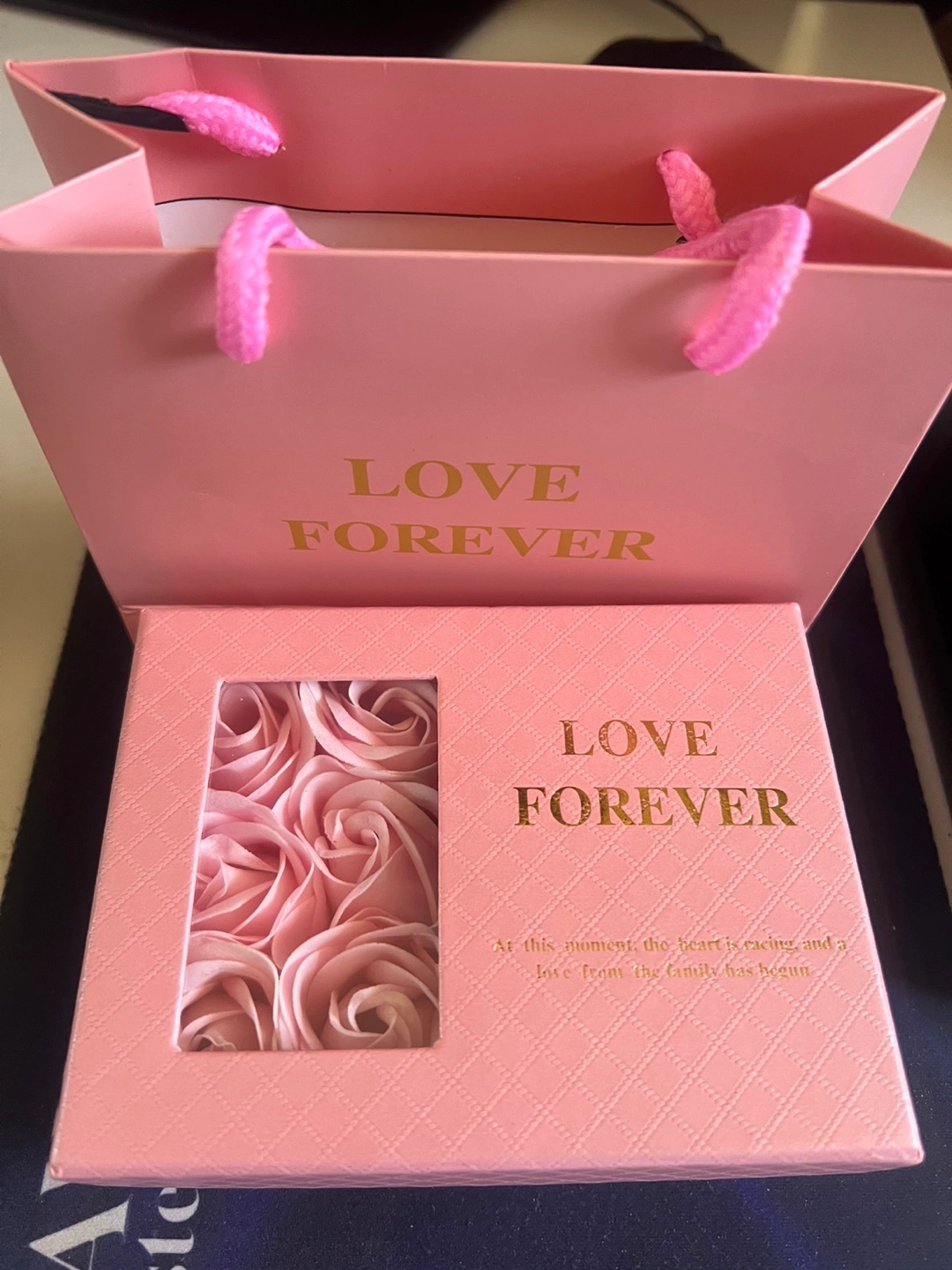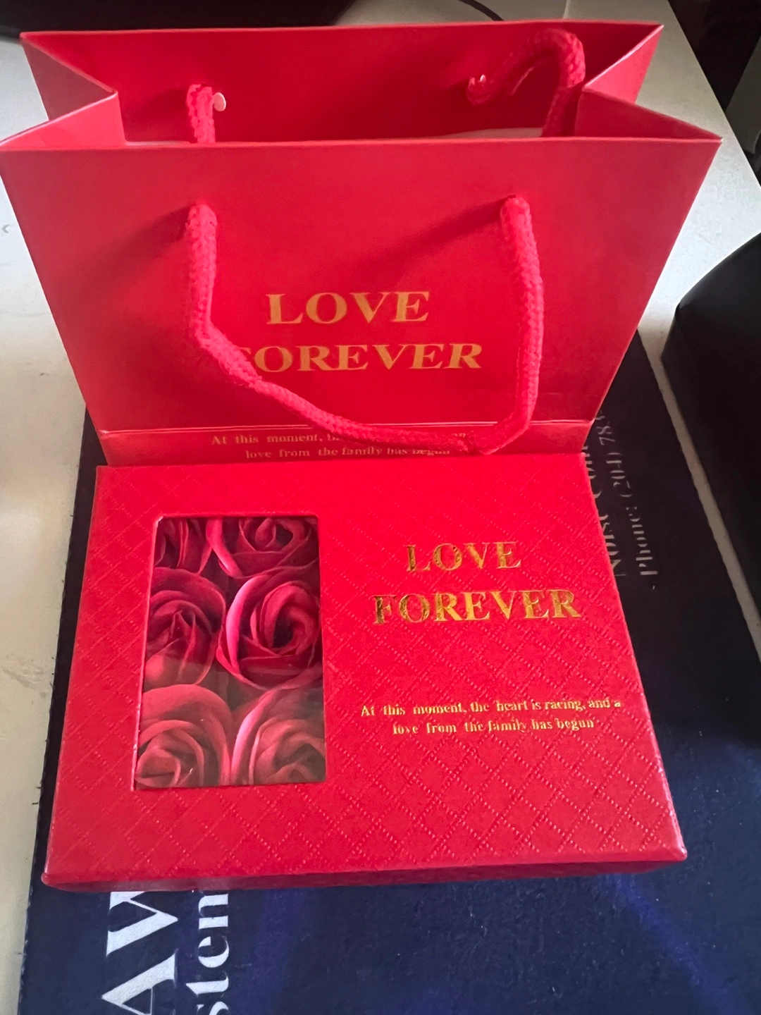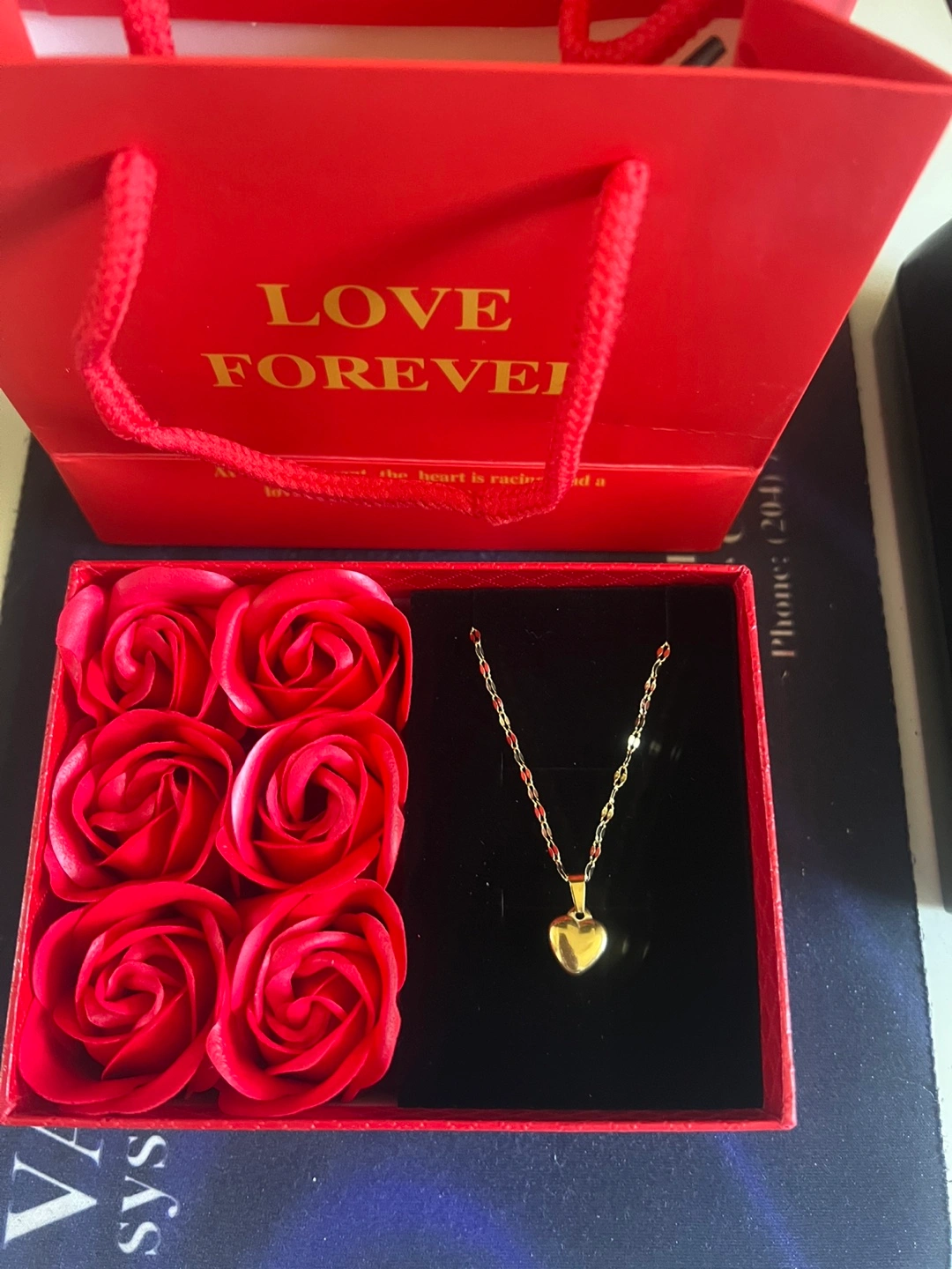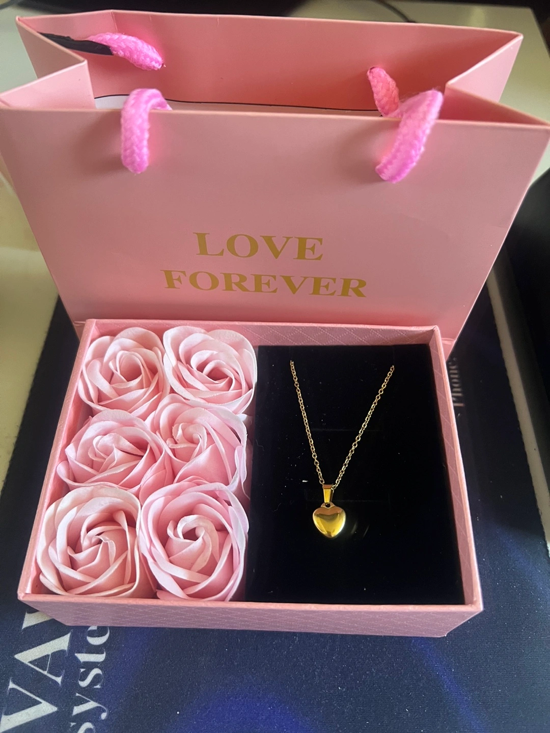 Brand new Love Forever necklace and rose soap flower gift set! It comes in a cute box with a matching gift bag, perfect for gifting. The necklace features a delicate heart pendant.