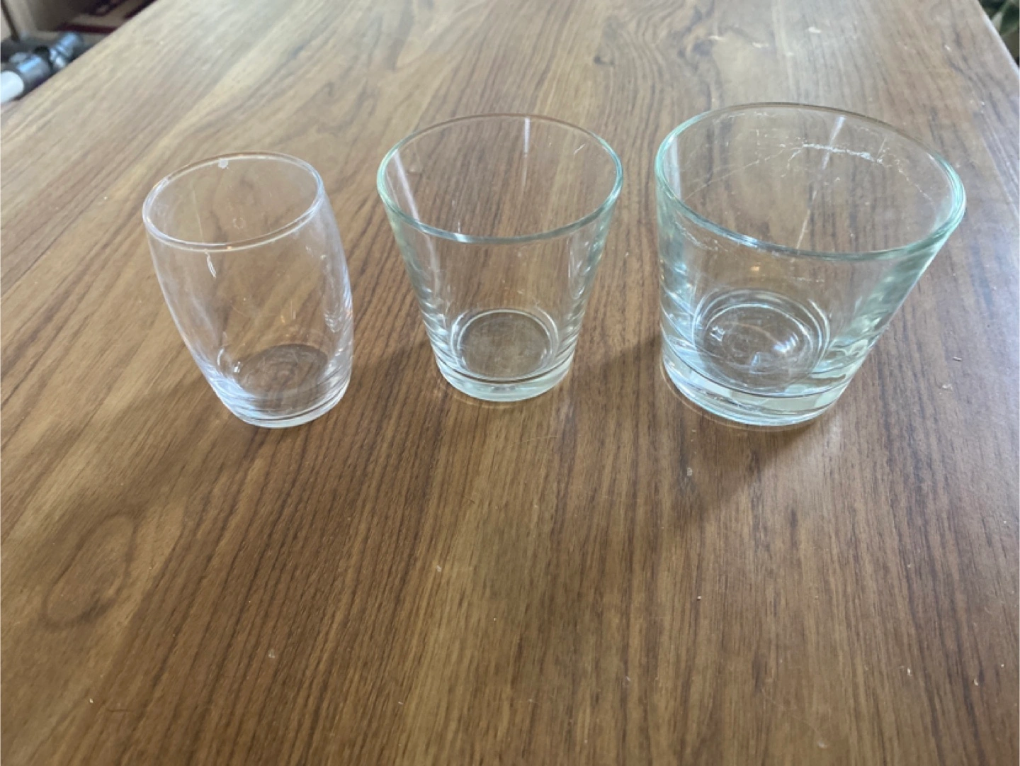 Selling a set of three clear drinking glasses! They come in various sizes, perfect for different beverages or uses. They're in good condition and ready for a new home
