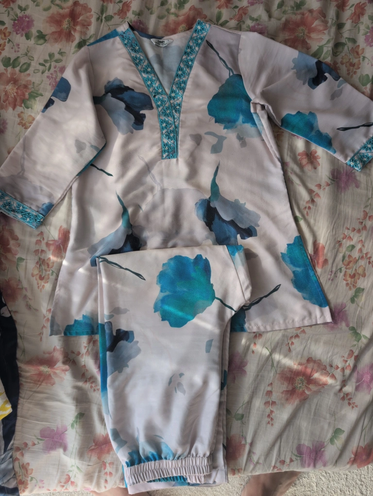 A comfy pajama set with a beautiful floral print! The colours are predominantly white and light pink with blue floral accents. Perfect for a cozy night's sleep! fits medium as well as large...