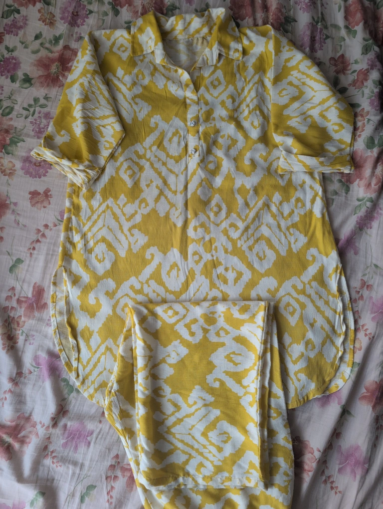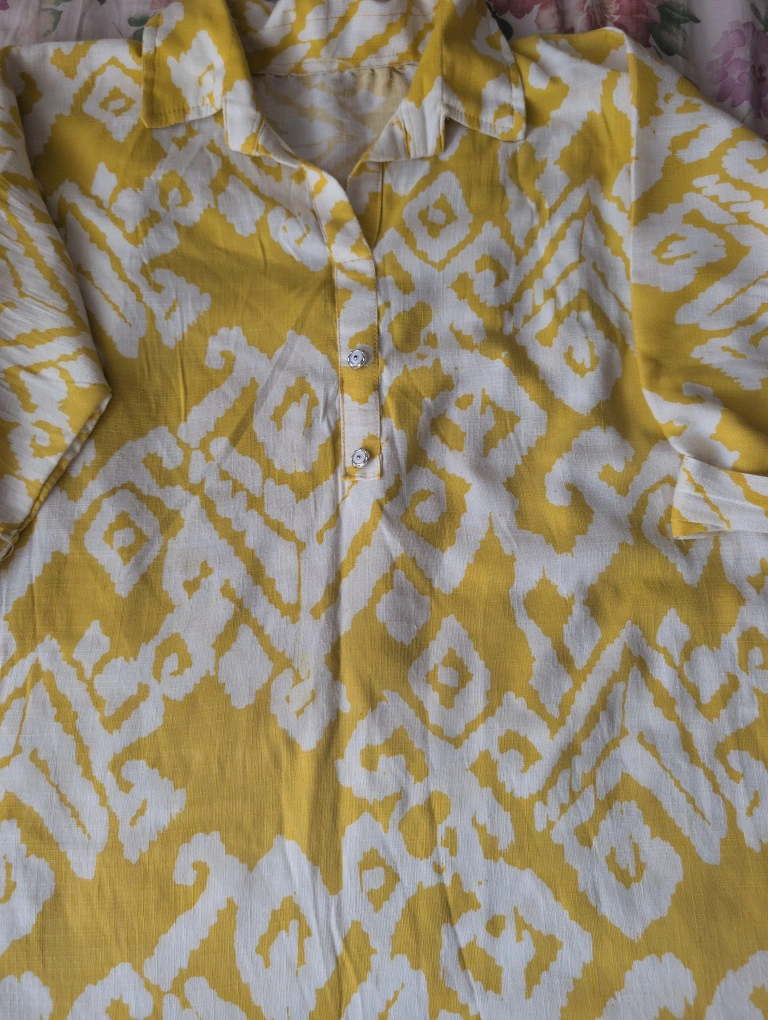 A cheerful tunic top featuring a yellow and white geometric pattern! It has a collared neckline with a partial button-down closure and short sleeves. Perfect for adding a pop of colour to your wardrobe!