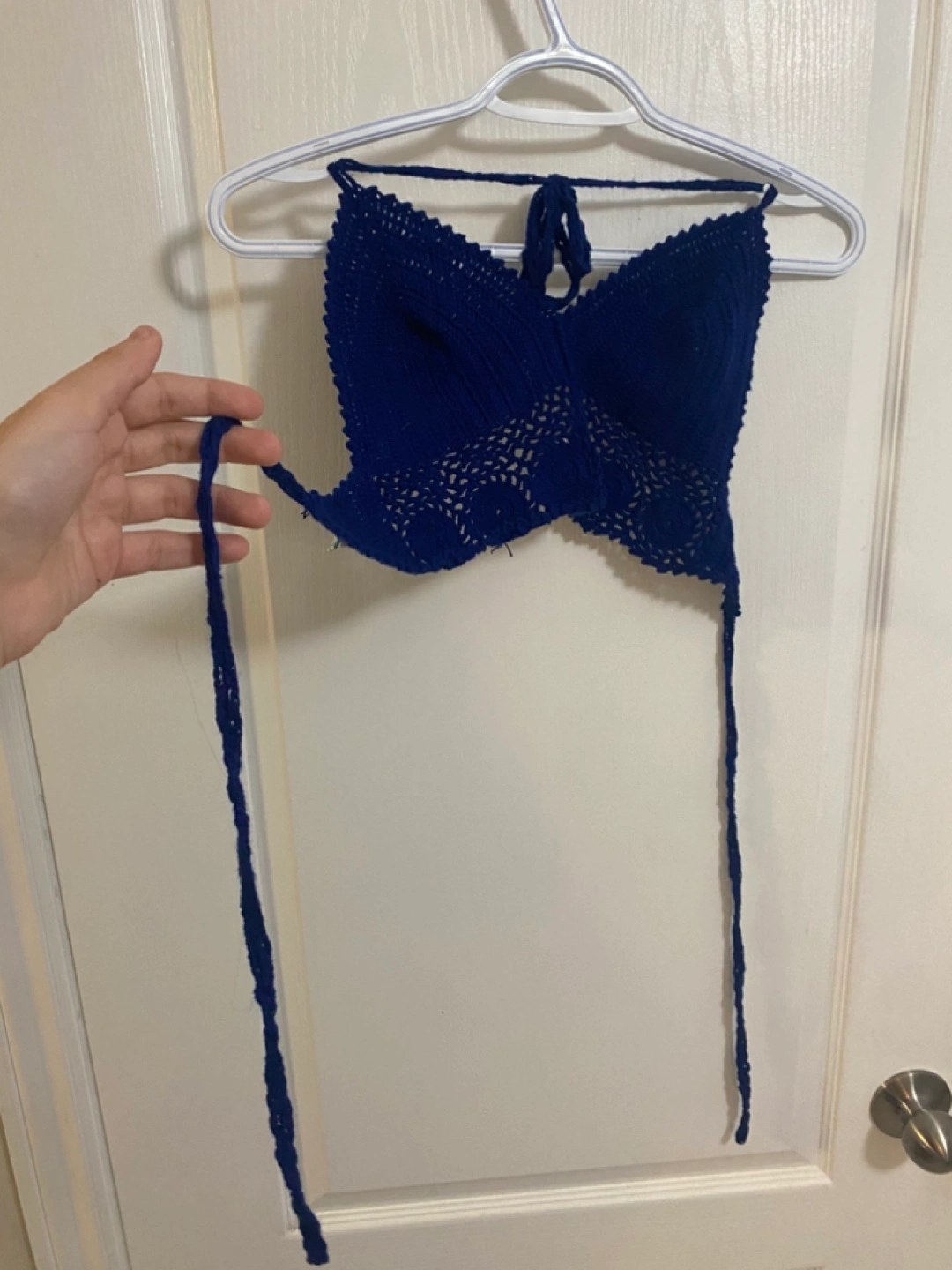 Selling a handmade crochet halter top in a beautiful blue colour. It's in great condition and perfect for summer! The intricate crochet detailing adds a unique touch to this stylish piece. It's a great addition to any wardrobe!