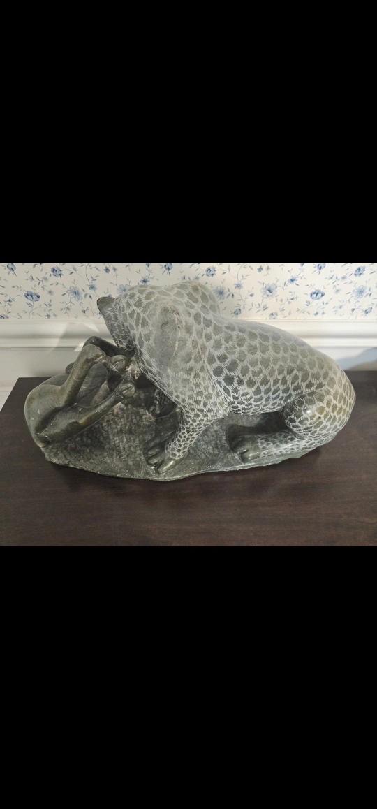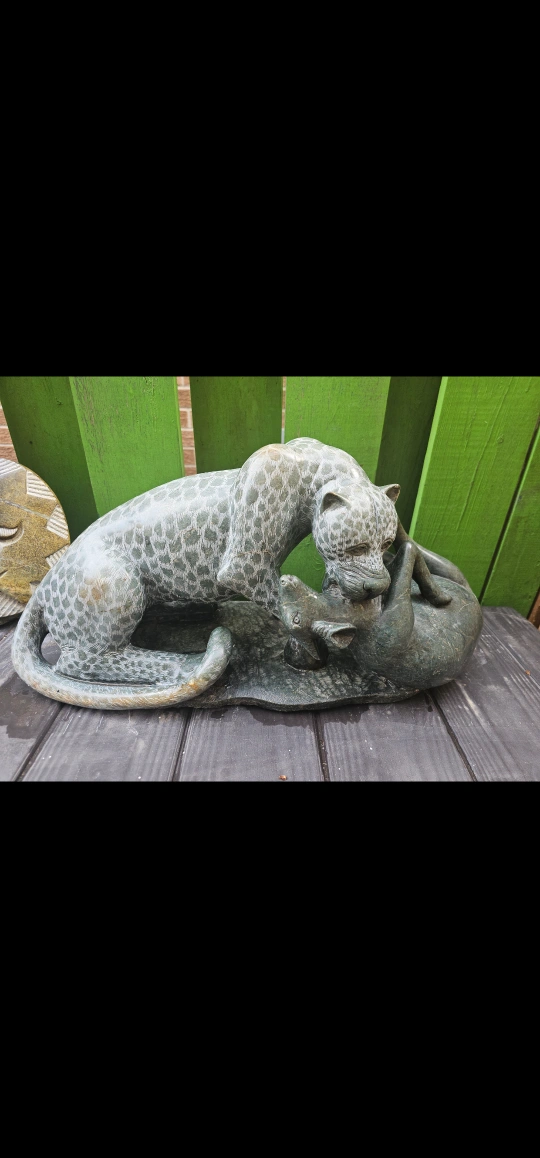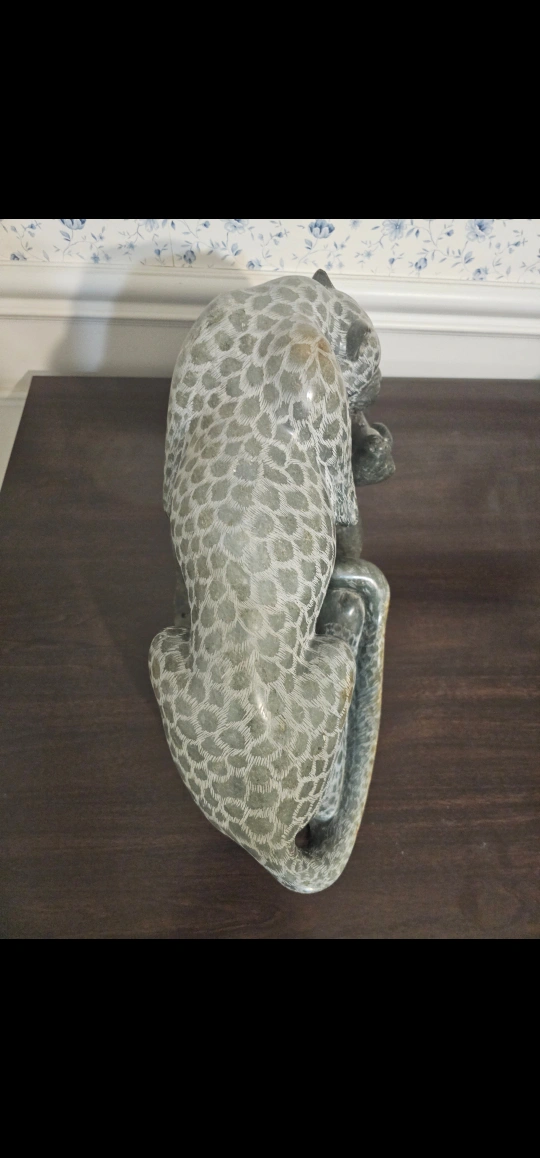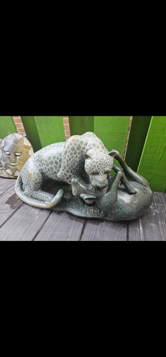 This is a beautiful hand-carved stone sculpture of a leopard. It would make a great addition to any home decor. The sculpture has a unique design and intricate details, making it a standout piece. from Harare Zimbabwe artist Freshman