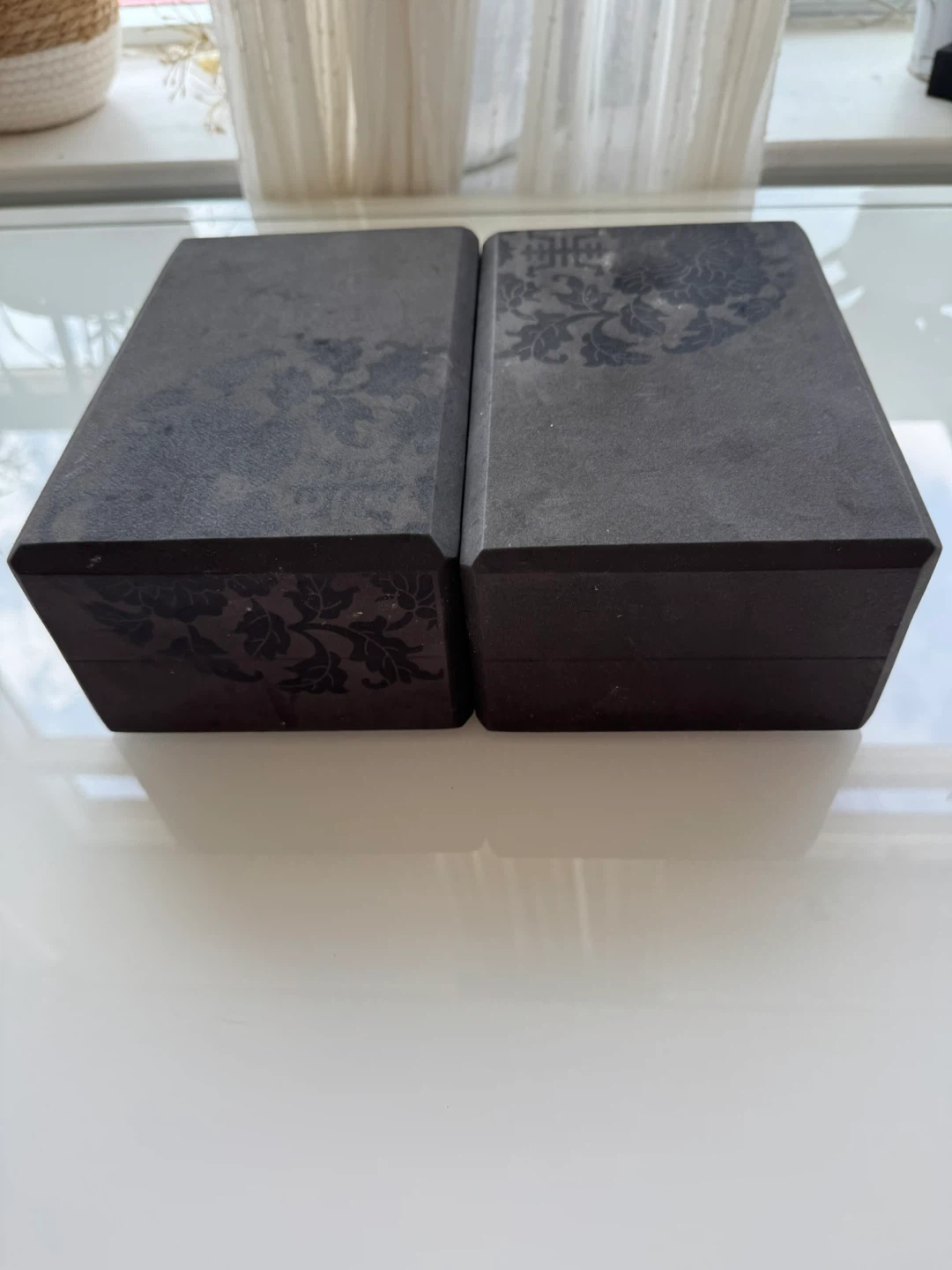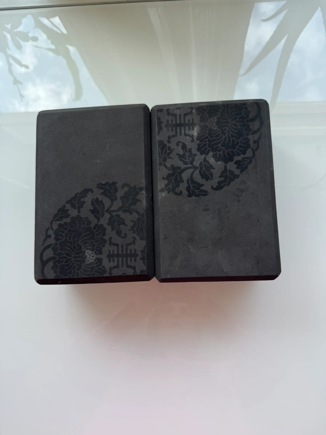 Selling a set of two yoga blocks in black. They have a lovely floral design on them. Perfect for supporting your practice!