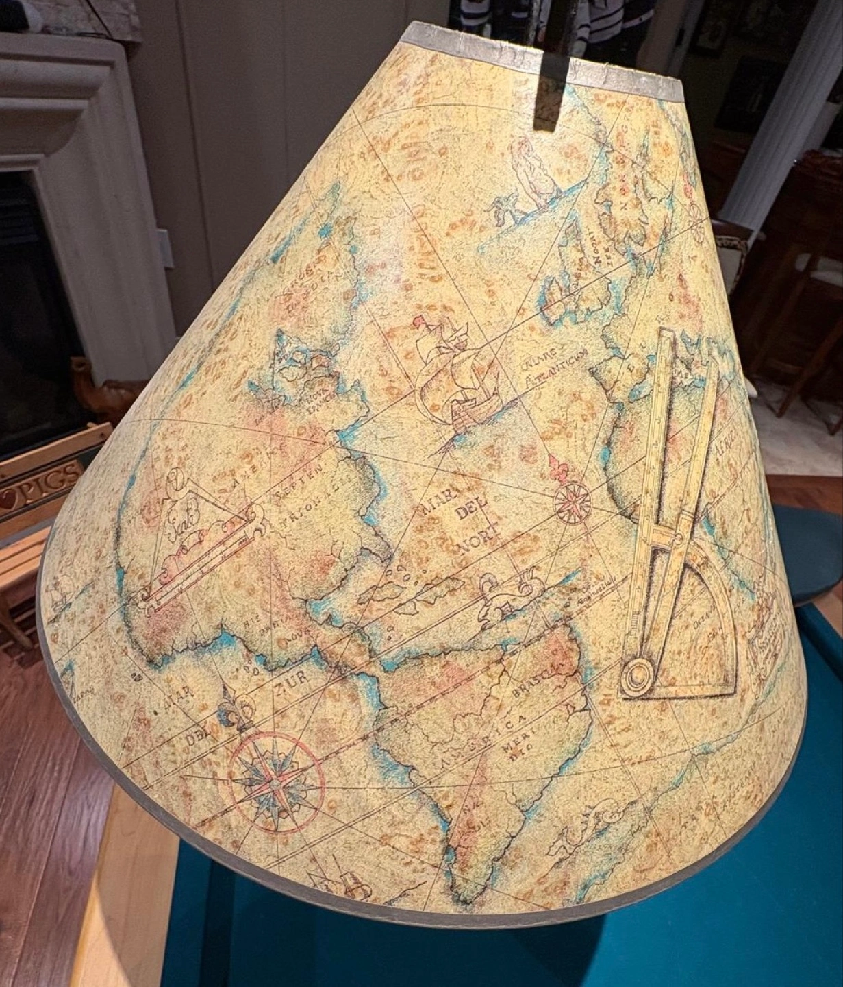 Looking to add a touch of vintage charm to your home? I'm selling this unique lamp featuring a world map design on the shade. It comes with a sturdy iron base that adds to its character. It is in good condition and ready to brighten up any room!