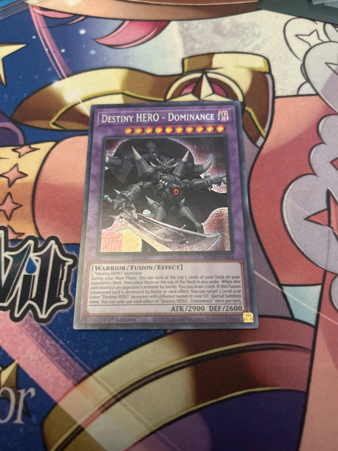 Selling a Destiny HERO - Dominance Yu-Gi-Oh! card It's a Warrior/Fusion/Effect monster card with ATK/2900 and DEF/2600 Card Text: During your Main Phase: You can look at the top 5 cards of your Deck or your opponent's Deck, then place them on the top of the Deck in any order. When this card destroys an opponent's monster by battle: You can draw i card. If this Fusion Summoned card is destroyed by battle or card effect: You can target 3 Level 9 or lower Destiny HERO monsters with different names in your GY; Special Summon them. You can only use each effect of Destiny HERO-Dominance once per turn
