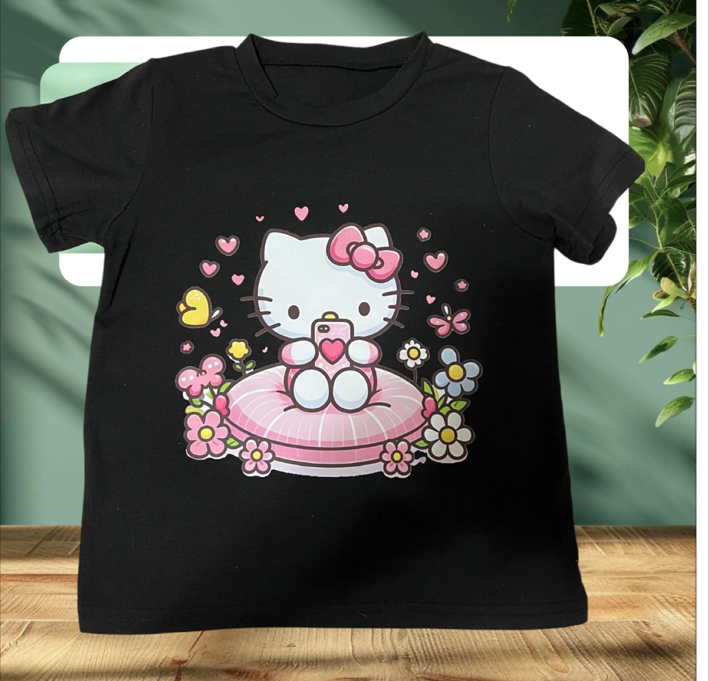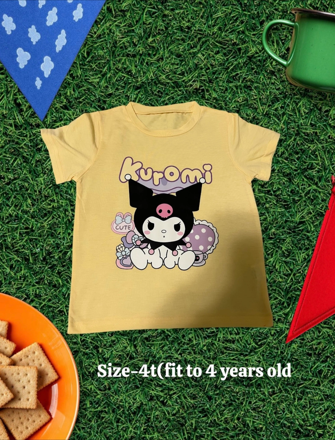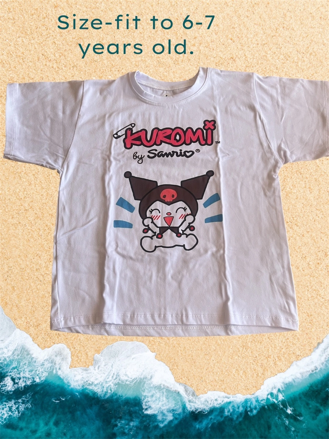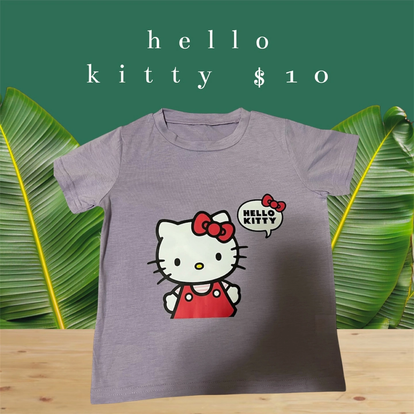 I have a selection of adorable Sanrio kids' t-shirts for sale! There's a variety of designs featuring Hello Kitty and Kuromi. Sizes fit approximately: - Kuromi white tee: 6-7 years old - Kuromi yellow tee: 4T (fits to 4 years old) - Hello Kitty purple tee: $10 - Hello Kitty black tee