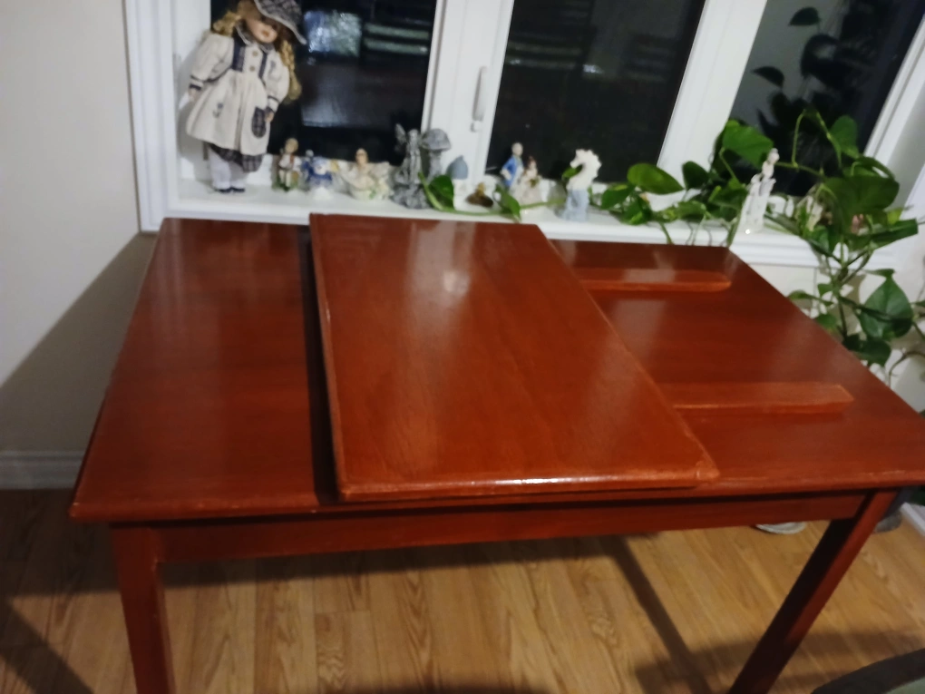 Selling a dining table with six matching chairs. The set is made of wood and features a reddish-brown finish. The chairs have light beige corduroy seats. Perfect for a family dining room!pet and smoke free