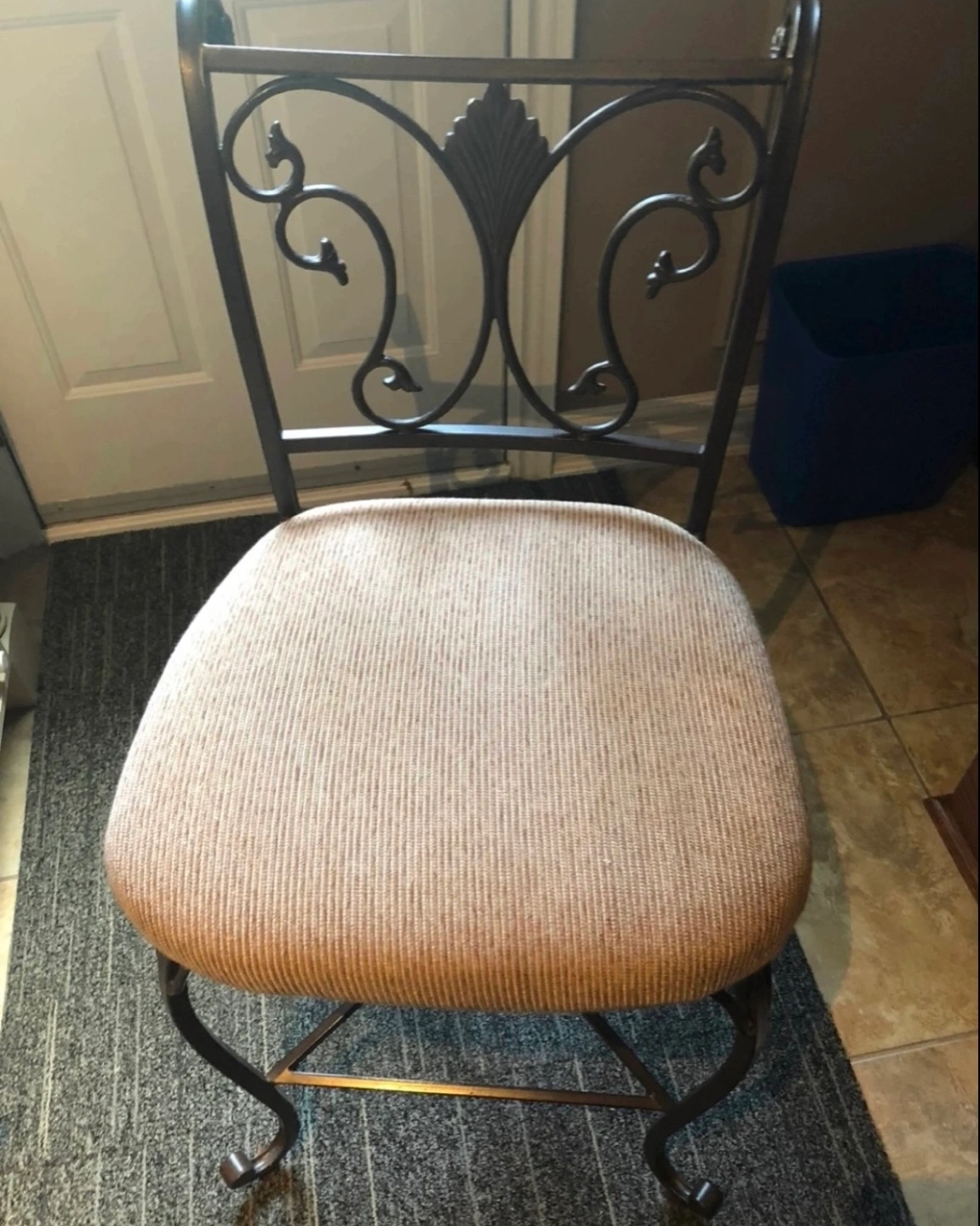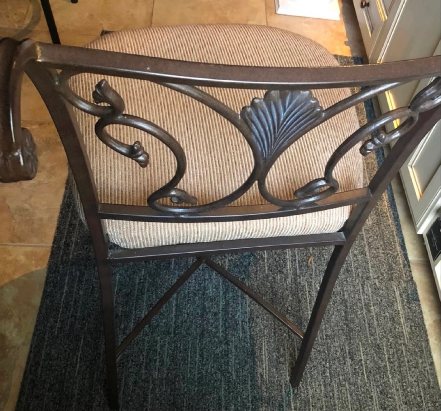 Selling 2 Wrought iron bar/ kitchen counter bar stool with a padded seat. The seat is beige with a striped fabric. The metal frame has a dark brown finish. Metal frame kitchen counter bar stool. Ornate detailing on the back. In very good condition. Asking $35 each