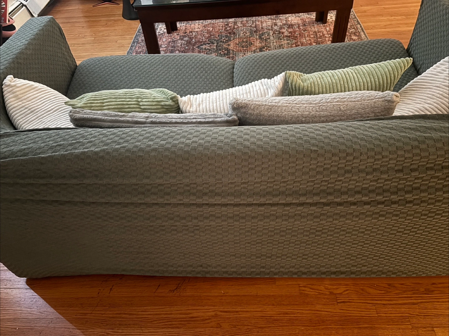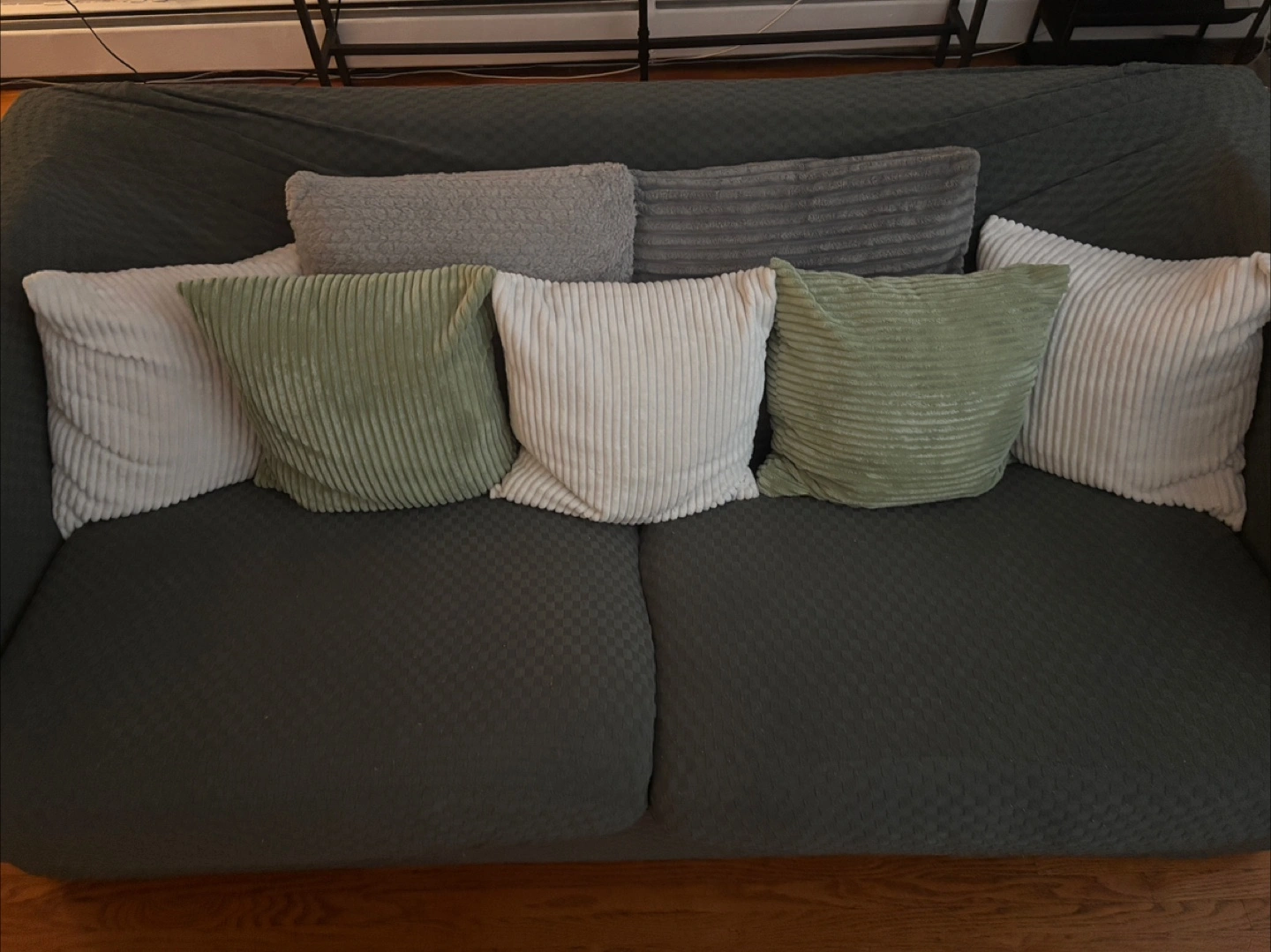 Looking to give away my couch, with dark grey/green couch cover and cushions included as pictured. This is a beige loveseat style pull out couch, please keep in mind this a really heavy couch as a result. I am to relocate from my current home within the next month and no longer have the use for my well loved couch! Please ensure you have the manpower and a truck to move the piece. :)