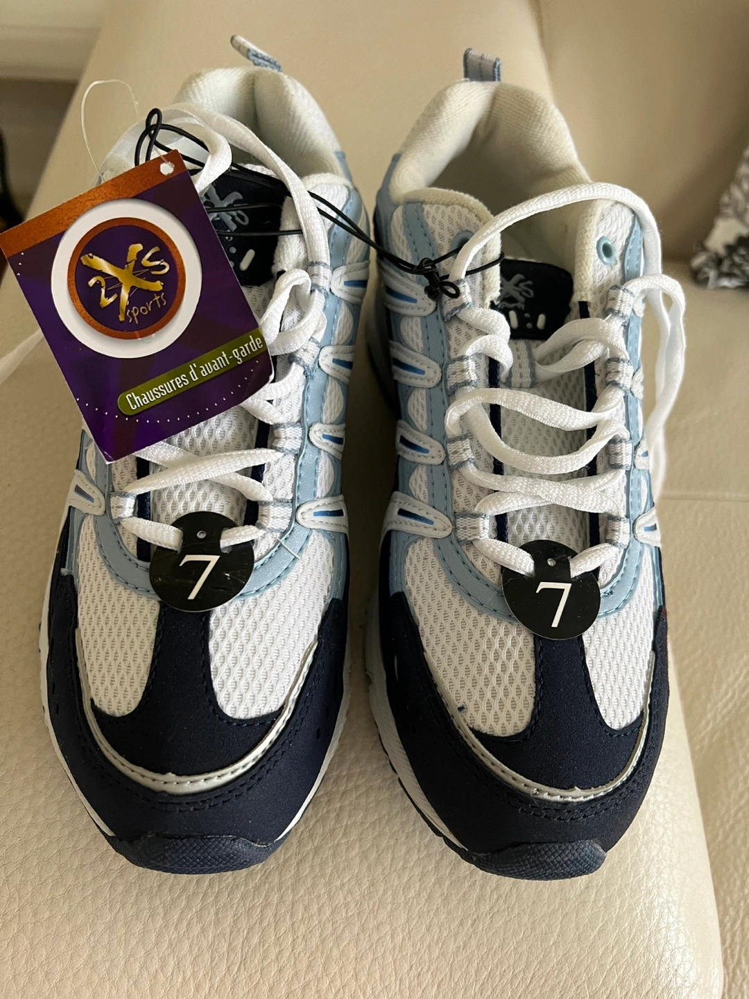 Selling a pair of brand new women's shoes from 2KSports in size 7. These shoes are in excellent condition, never worn, and ready for a new home! They feature a stylish design with white, light blue, and navy accents. Perfect for everyday wear or light athletic activities