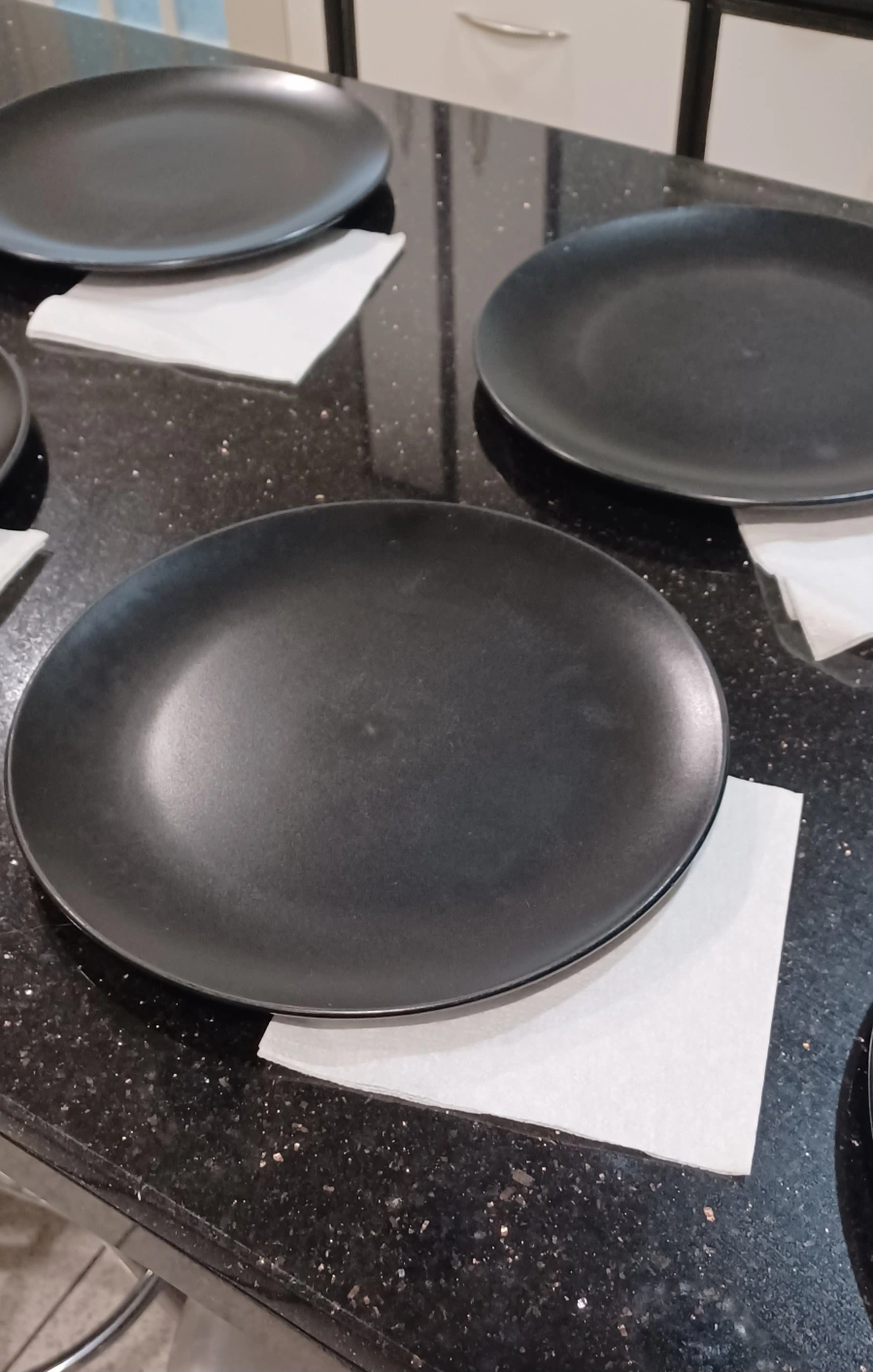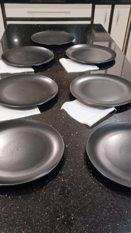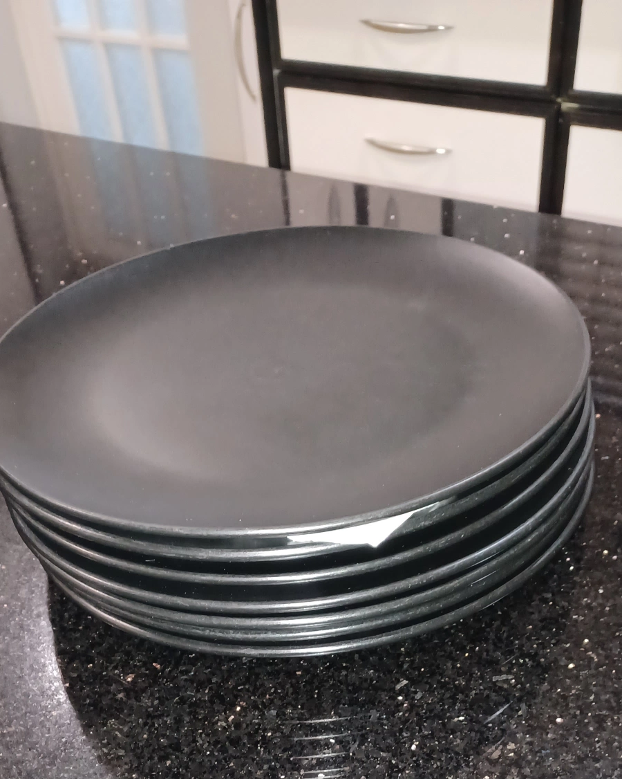 Selling a set of 7 IKEA plates in matte black. They are perfect for everyday use . Add a touch of modern elegance to your dining table with these stylish plates. They have some scratches on it but still have long life.