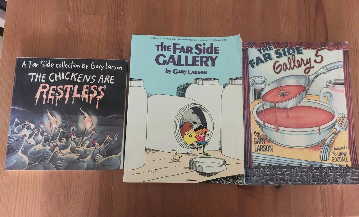 Collection of The Far Side books by Gary Larson. Includes 'The Chickens Are Restless', 'The Far Side Gallery', and 'The Far Side Gallery 5'. A great addition to any comic book collection! Pickup only unless bundled with an item $5 or more.