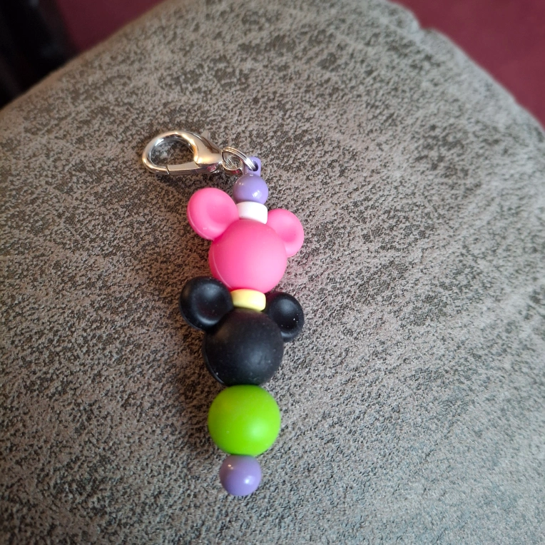 This is a cute handmade charm featuring a Mickey Mouse inspired design. It's made with colourful beads and has a lobster clasp for easy attachment to bags, zippers, or anything you like! Perfect for adding a bit of fun to your everyday items