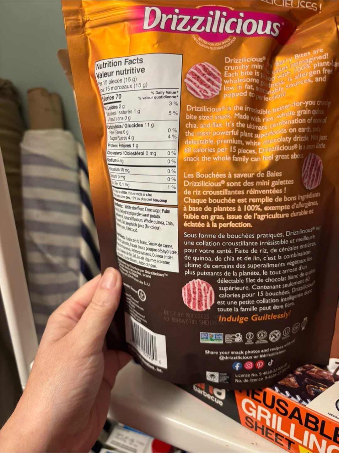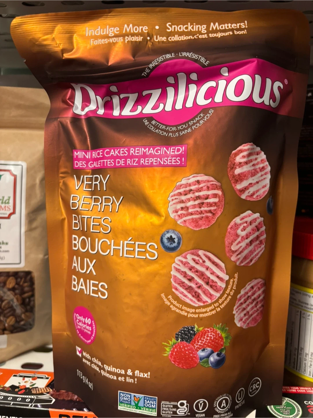 Enjoy these Drizzilicious Very Berry Bites! They're mini rice cakes reimagined, made with chia, quinoa, and flax. These tasty bites are only 60 calories per serving, making them a guilt-free snack. Perfect for satisfying your sweet tooth with a delightful berry flavour!
