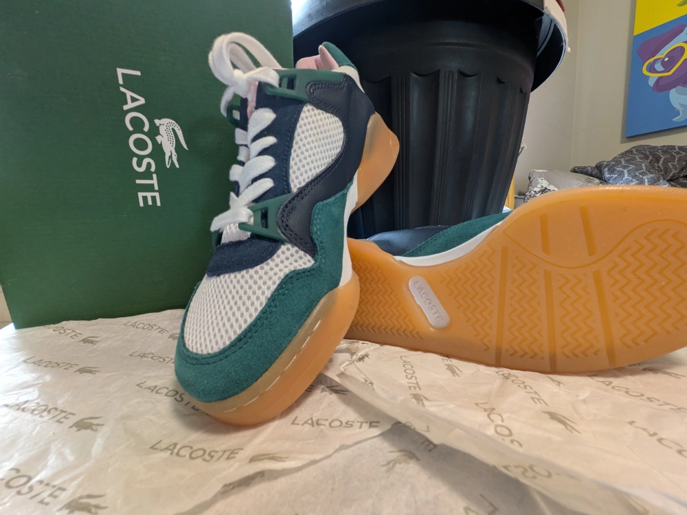 These Lacoste sneakers are in great condition and come with the original box! They're a super cute colour combination of navy, green, pink, and white. The size is 6 (US/CA)!