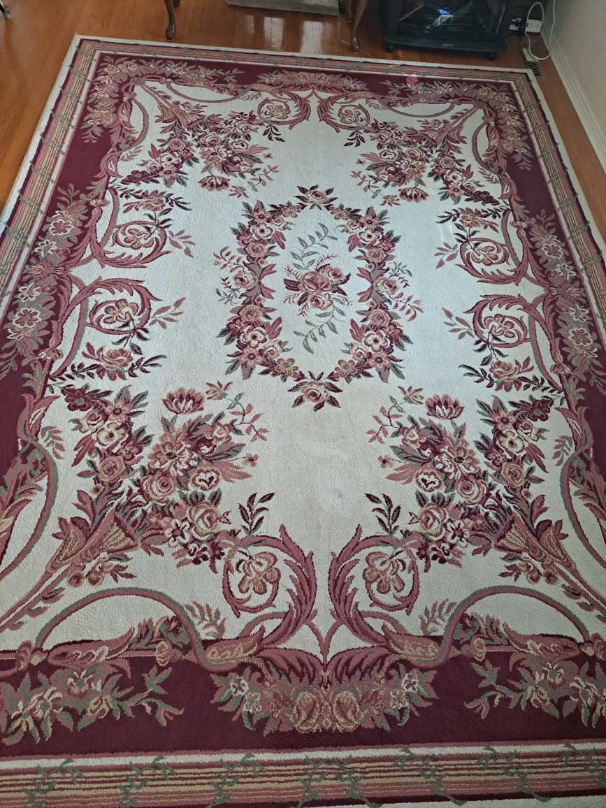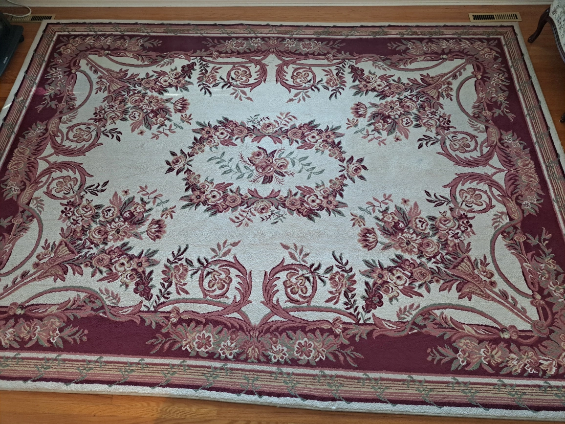 Selling a beautiful area rug with a floral pattern. It has a burgundy border and a lovely design that would look great in any room. It's in good condition and ready for a new home! Has a small spot please see last photo. 7' 10" x 10' 9" 94" x 129" just stream cleaned non smoking home Killarney area cash only please