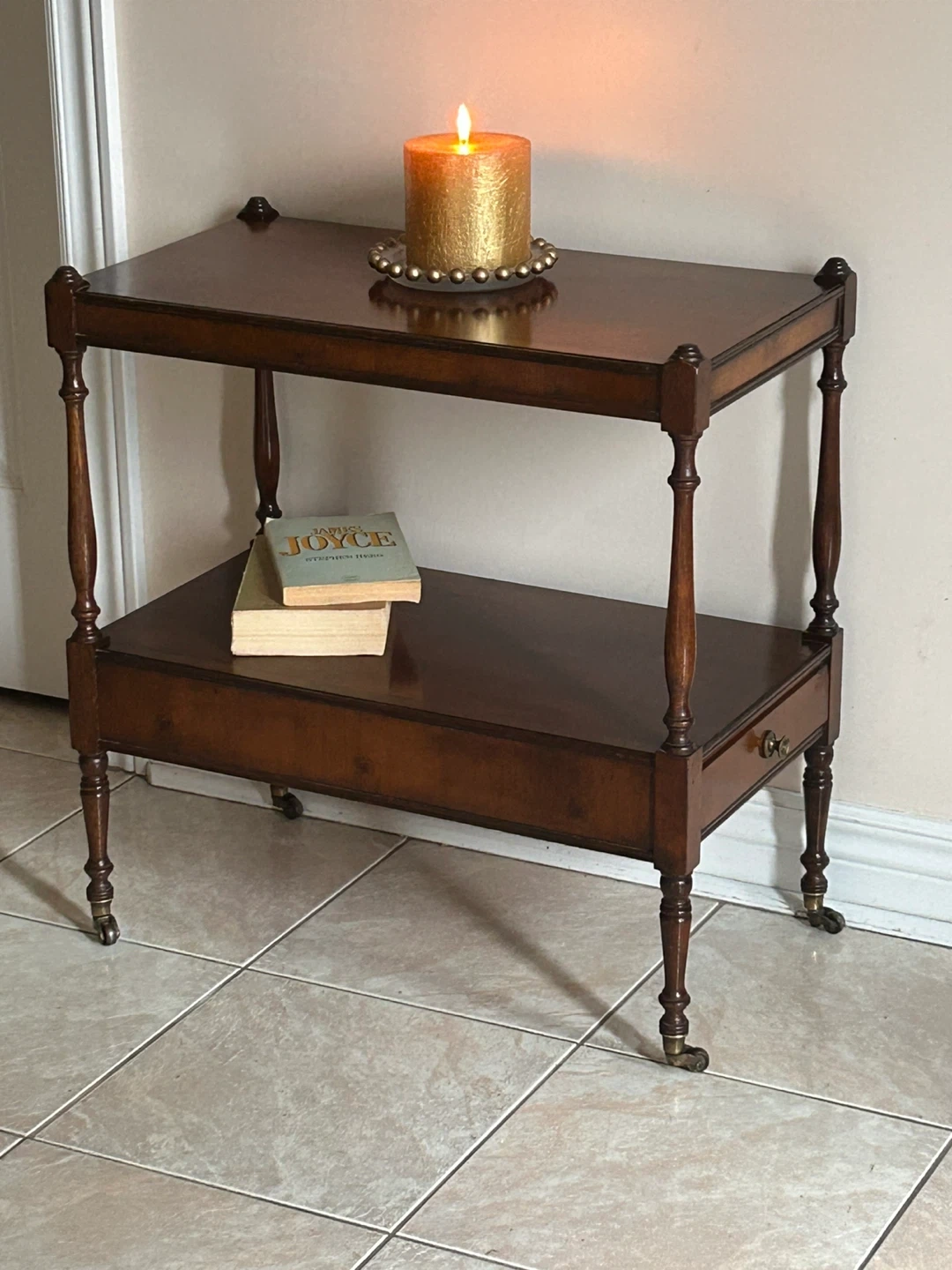Selling a lovely vintage brown wooden side table. It features a two-tier design with a small drawer, perfect for adding a touch of classic charm to any room. The table has wheels for easy movement