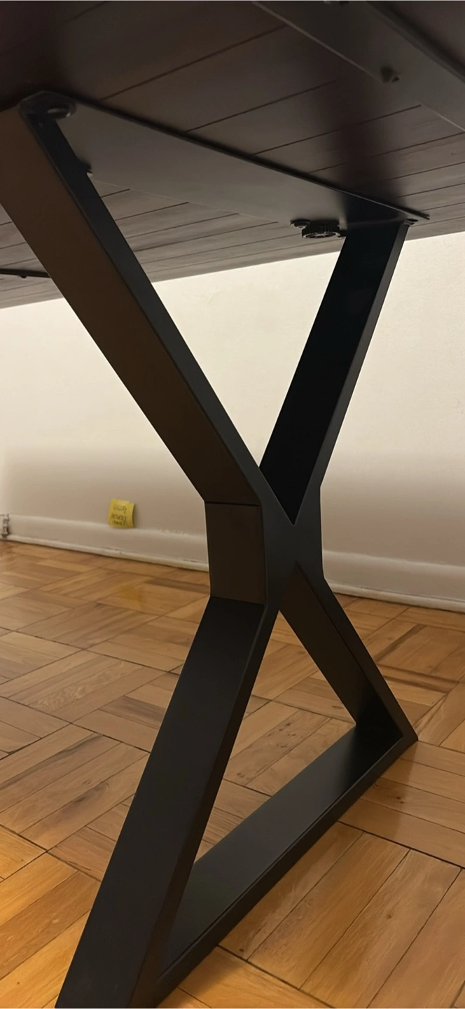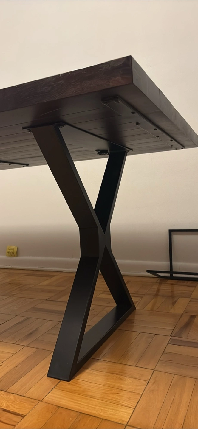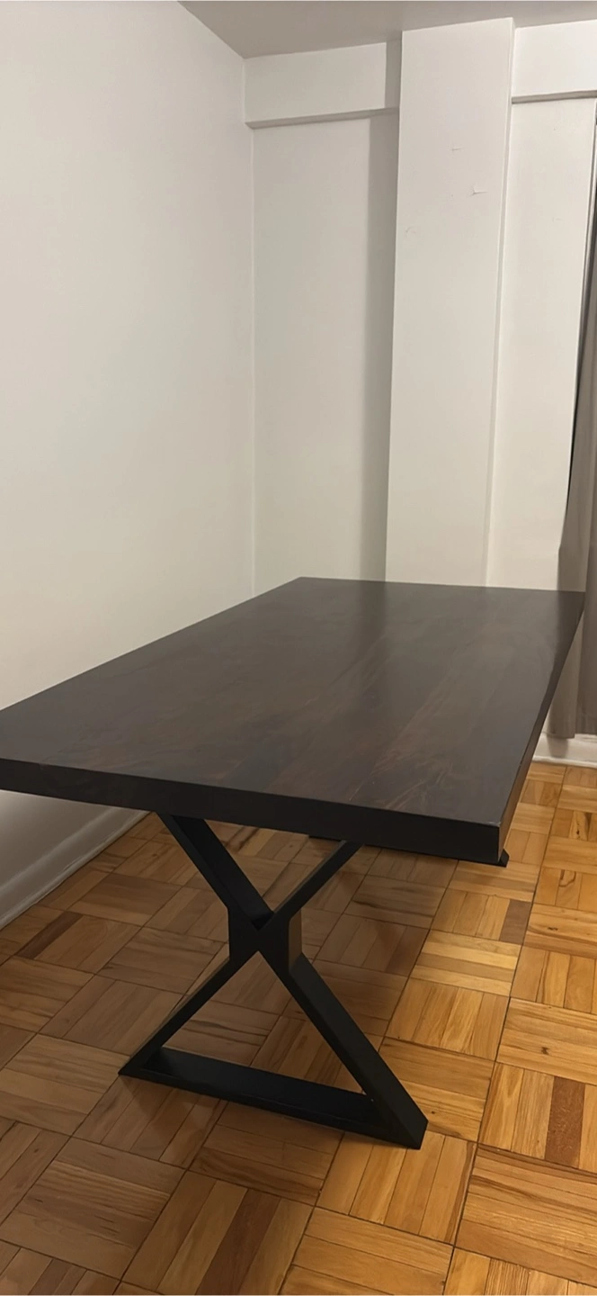 Selling a solid dark wood dining table with a modern, X metal legs. The table is in great condition, with a sleek, minimalist design that complements various decor styles.