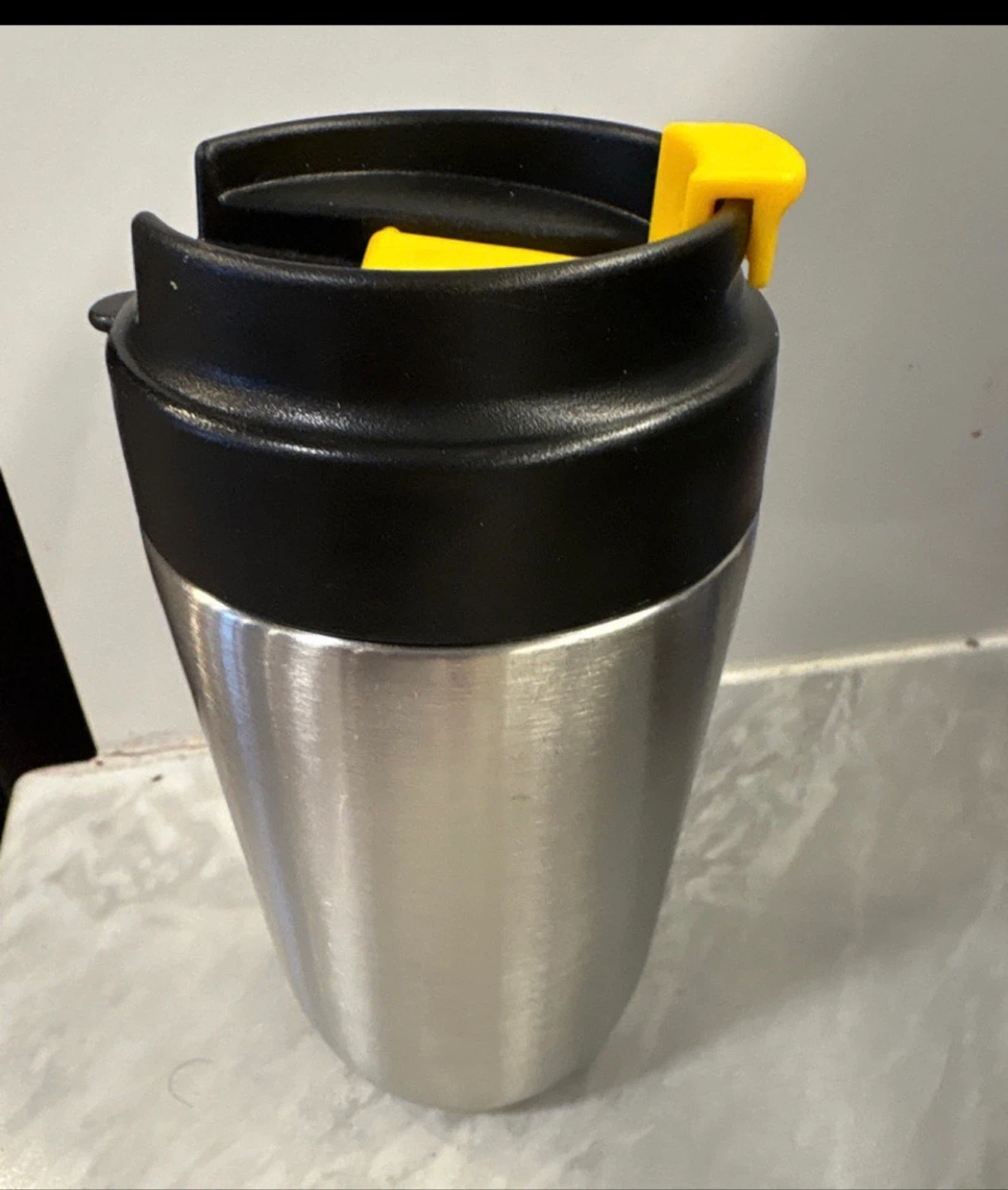 Selling a stainless steel travel mug with a black lid and a yellow latch. It's in great shape and ready to keep your drinks hot or cold on the go!