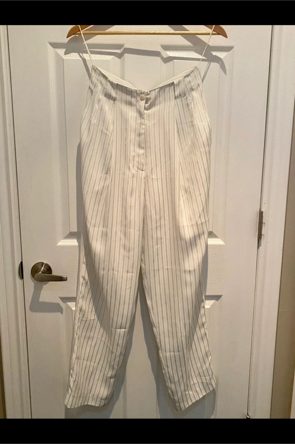 These are a pair of high-waisted trousers with a subtle striped pattern. They look like they'd be super comfy and stylish for everyday wear. Perfect for adding a touch of elegance to your wardrobe!