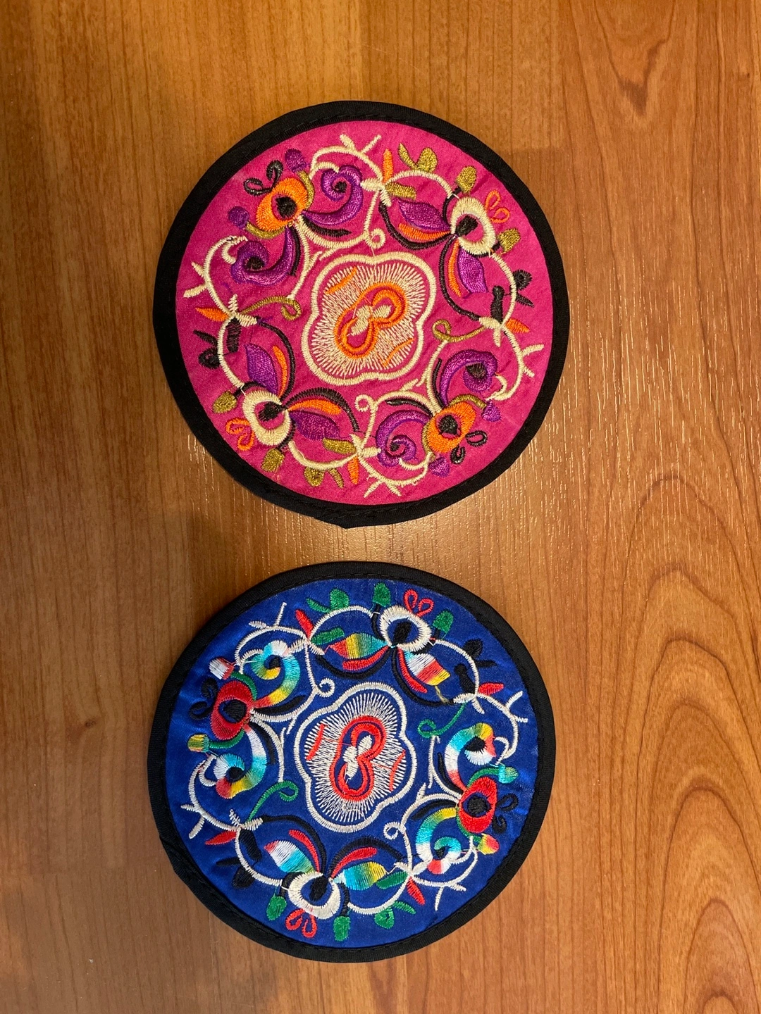 Here's a set of two embroidered coasters! One is pink and the other is blue, both with colourful floral designs. They're in great condition and ready to protect your surfaces in style