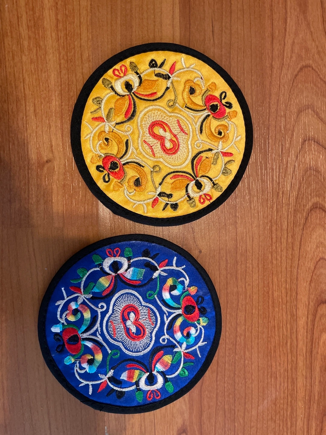 I'm selling a set of two embroidered coasters! They're in great condition and feature beautiful floral designs. One is yellow and the other is blue. Perfect for adding a touch of colour to your coffee table or desk