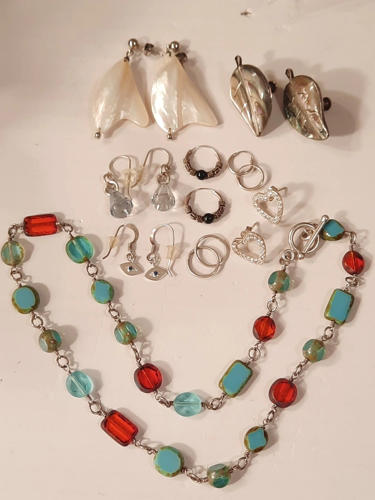 Selling a lovely collection of sterling silver jewellery! The set includes a colourful beaded necklace and several pairs of earrings. The necklace is marked "925" indicating sterling silver, as are some of the earrings. A great way to add some sparkle to your outfits!only the ones with sea shell white not sterling jyst plated the rest all are.pick up in oshawa