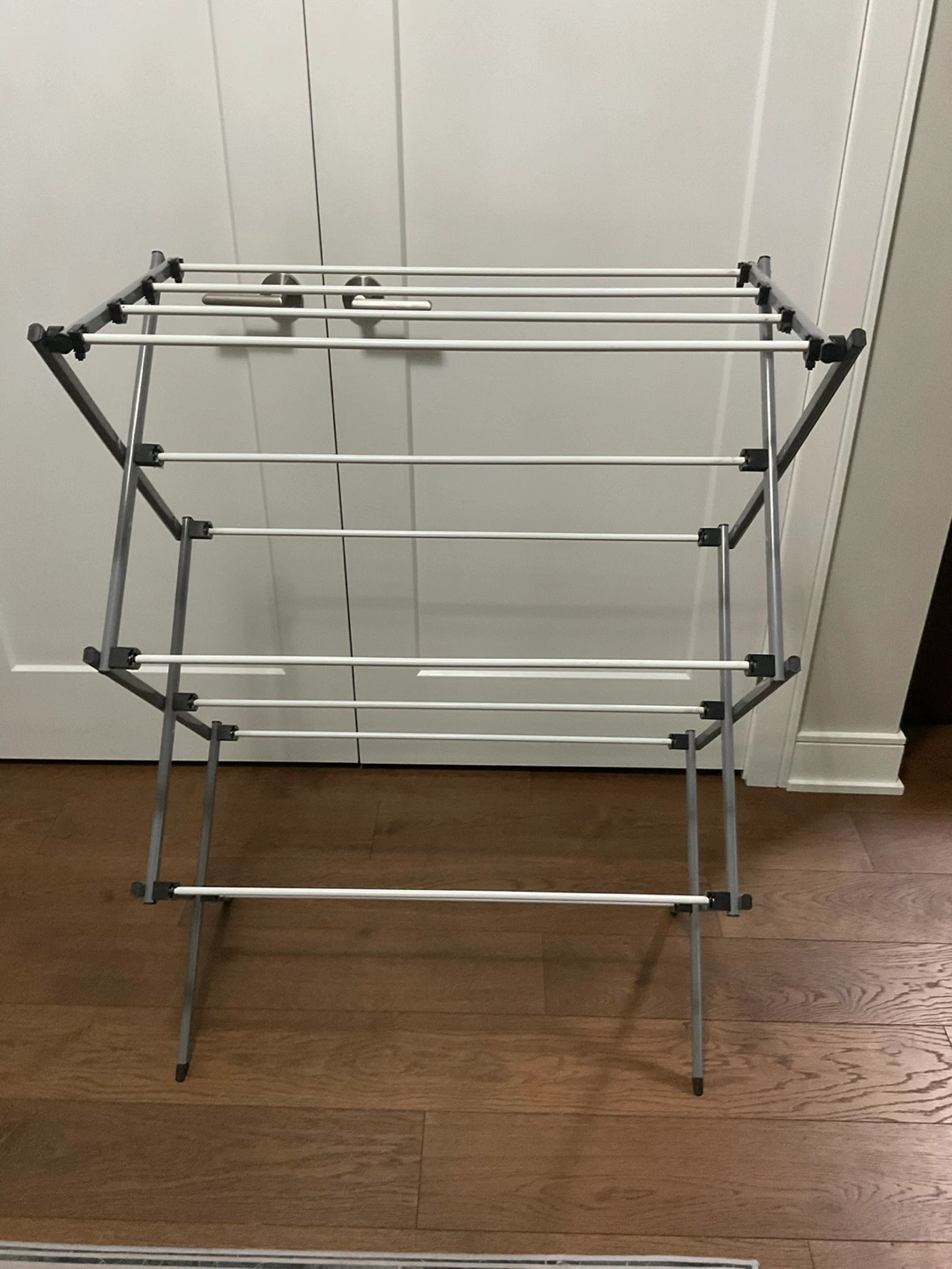 Selling a folding clothes drying rack. It's in great condition and perfect for small spaces. It folds up easily for storage when not in use. Great for apartments or anyone who wants to save on dryer costs!