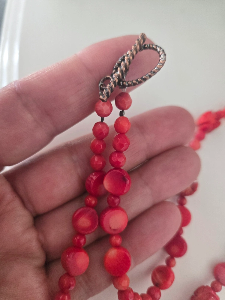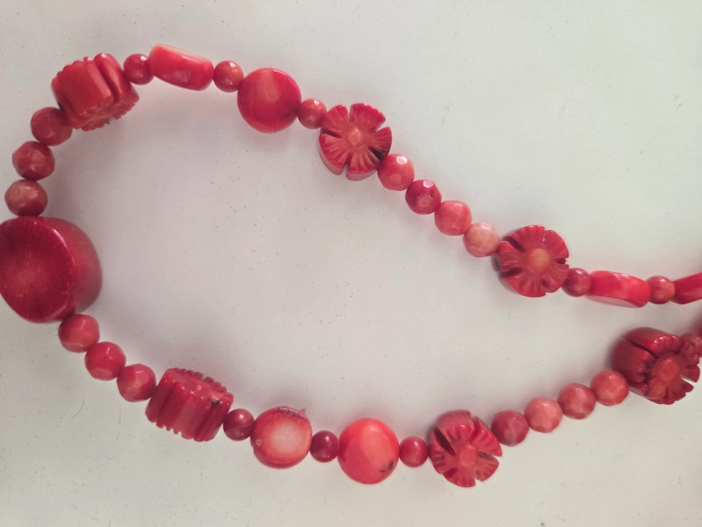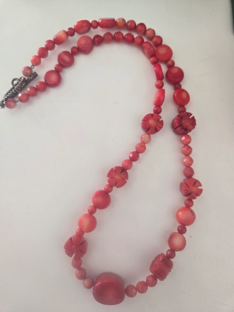 A beautiful vintage carved red coral beaded necklace with a unique design. It features various shapes and sizes of coral beads, including round, cylindrical, and flower-shaped beads. The necklace is in good condition and has a clasp closure. A lovely addition to any jewelry collection!