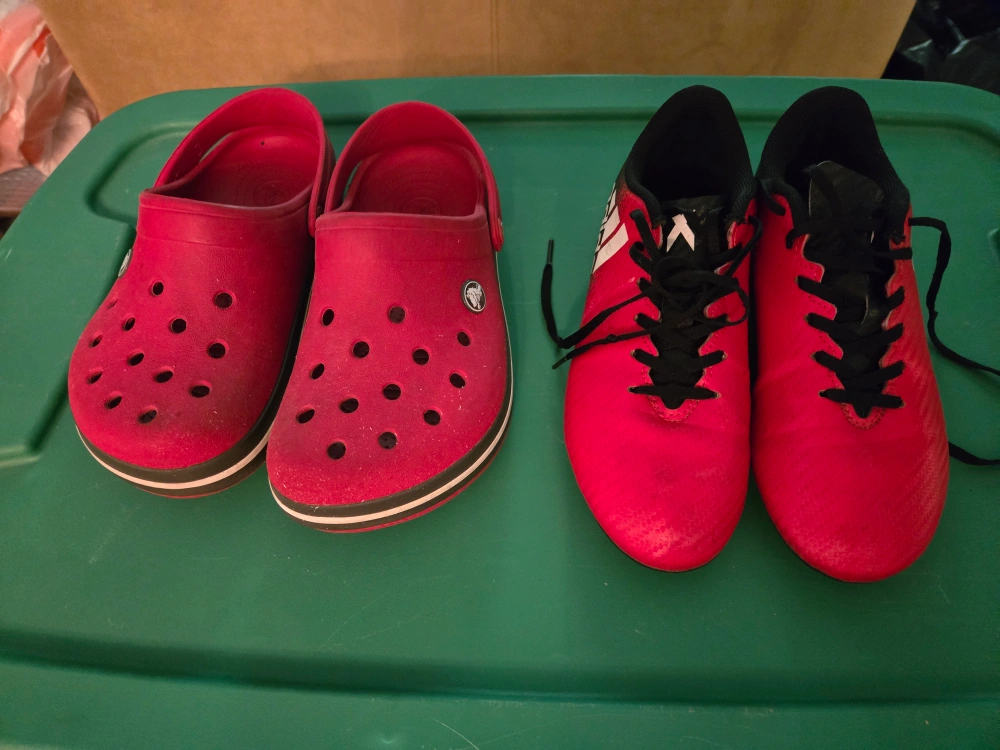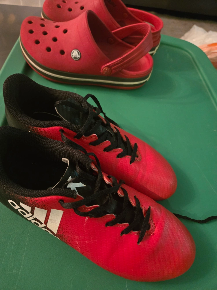 Selling a pair of red Crocs and Adidas soccer cleats, both in youth size 3. Great for casual wear or hitting the field! Gently used in a good condition....$20 crocs, $10 cleats.