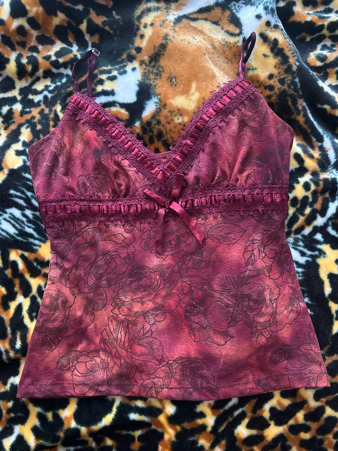 PICK UP ONLY A cute burgundy babydoll top with floral patterns all over and adjustable straps. It’s a thrifted top with no brand and sizing shown. It has lace trim along with ribbon underneath the lace and a bow detail in the middle. The closer picture of the top shows the sparkles on the floral designs.