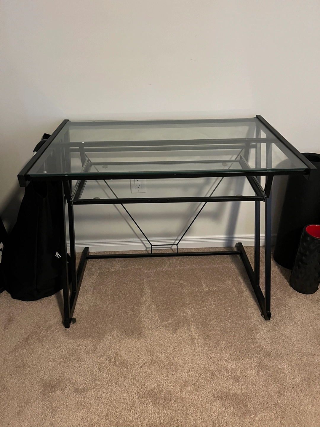 Selling a desk with a glass top and a black metal frame. It's in great shape and would be perfect for a home office or student. The desk is sturdy and has a modern look. Feel free to ask any questions!