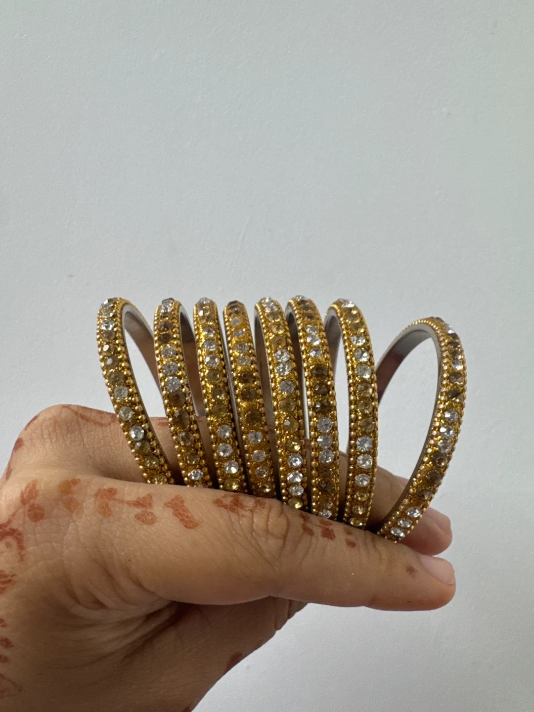 Selling a set of gold-toned 8 bangles with crystal detailing! These bangles are perfect for adding a touch of sparkle to any outfit. They are in great condition and ready for a new home