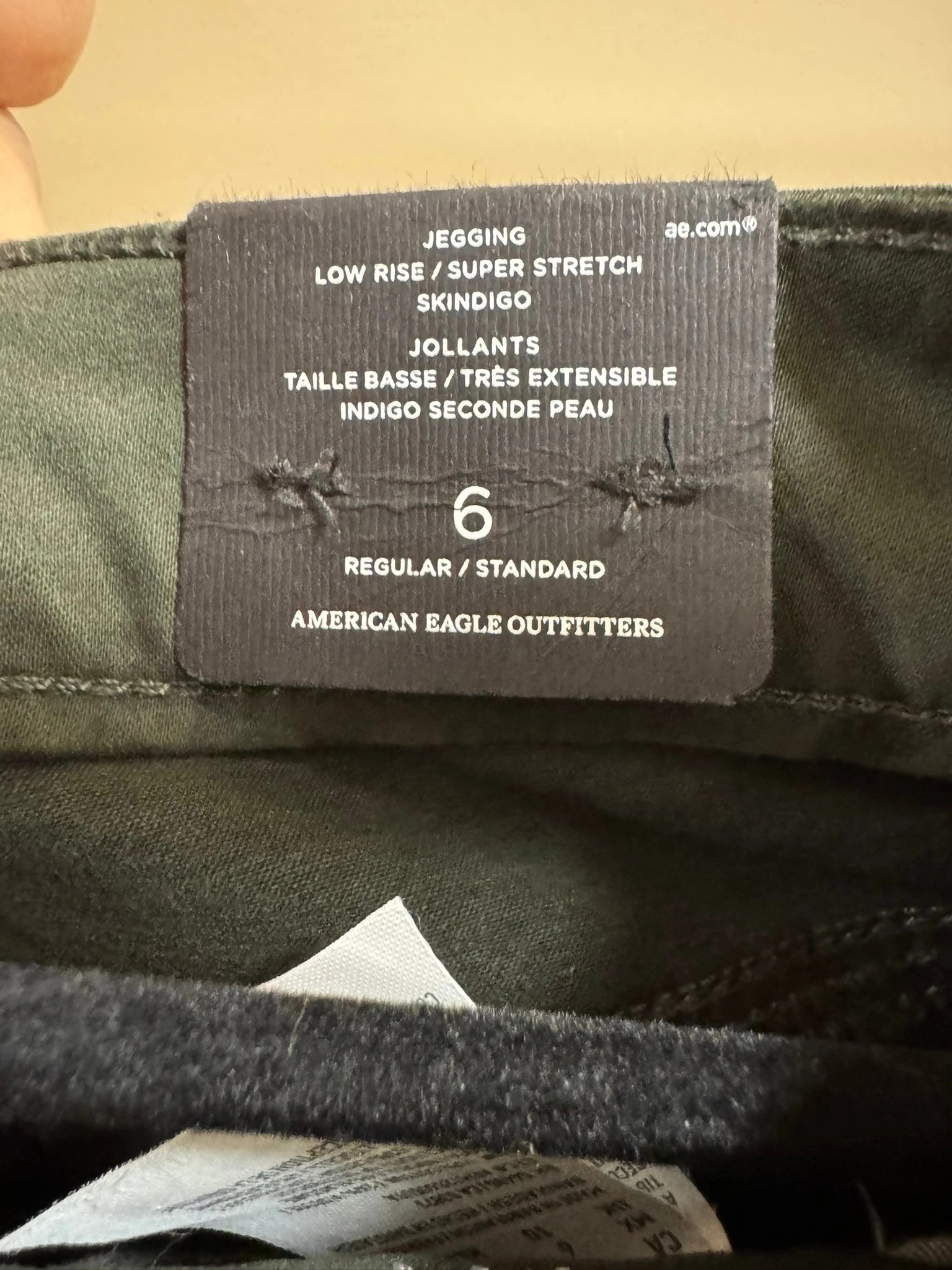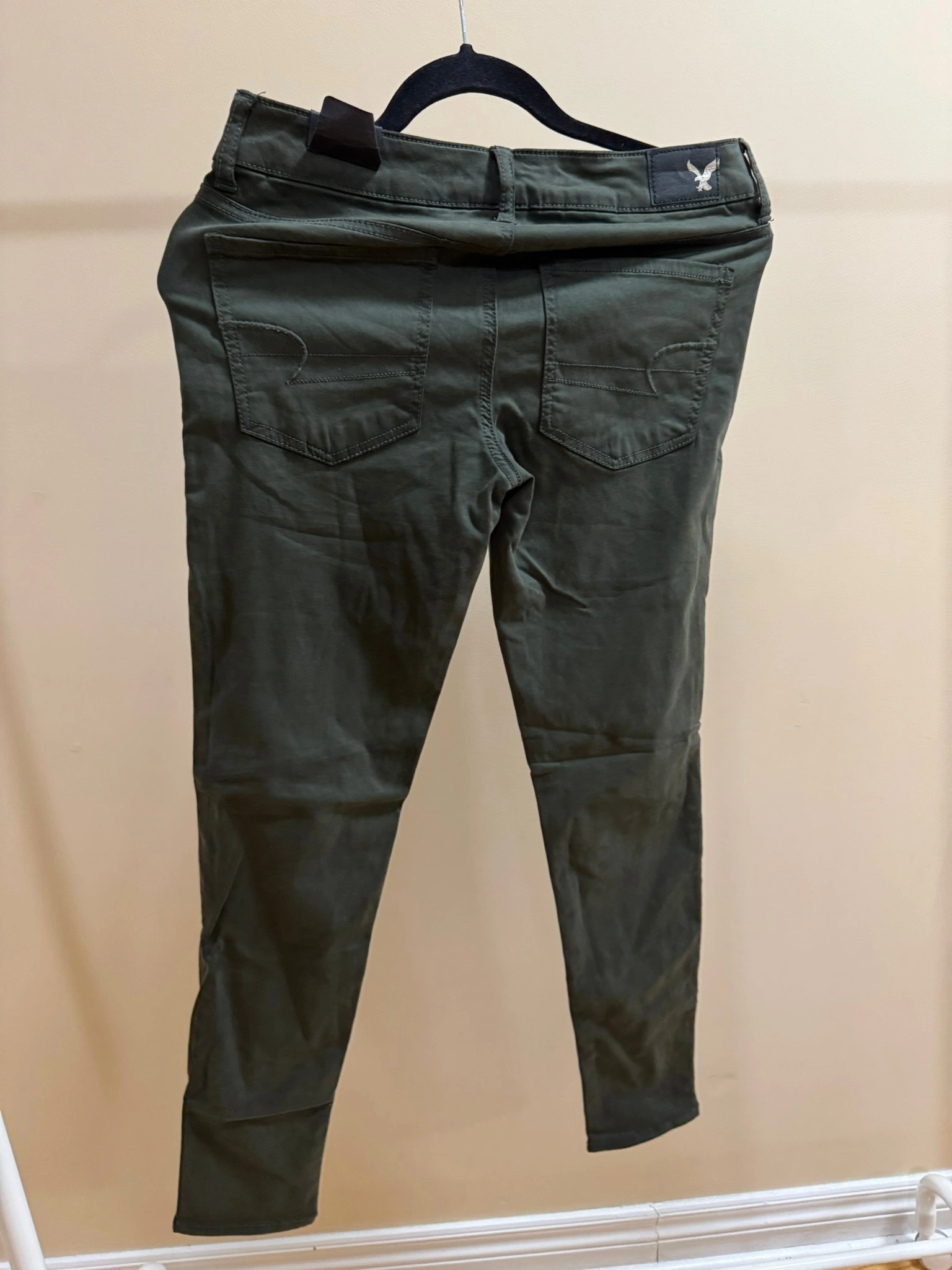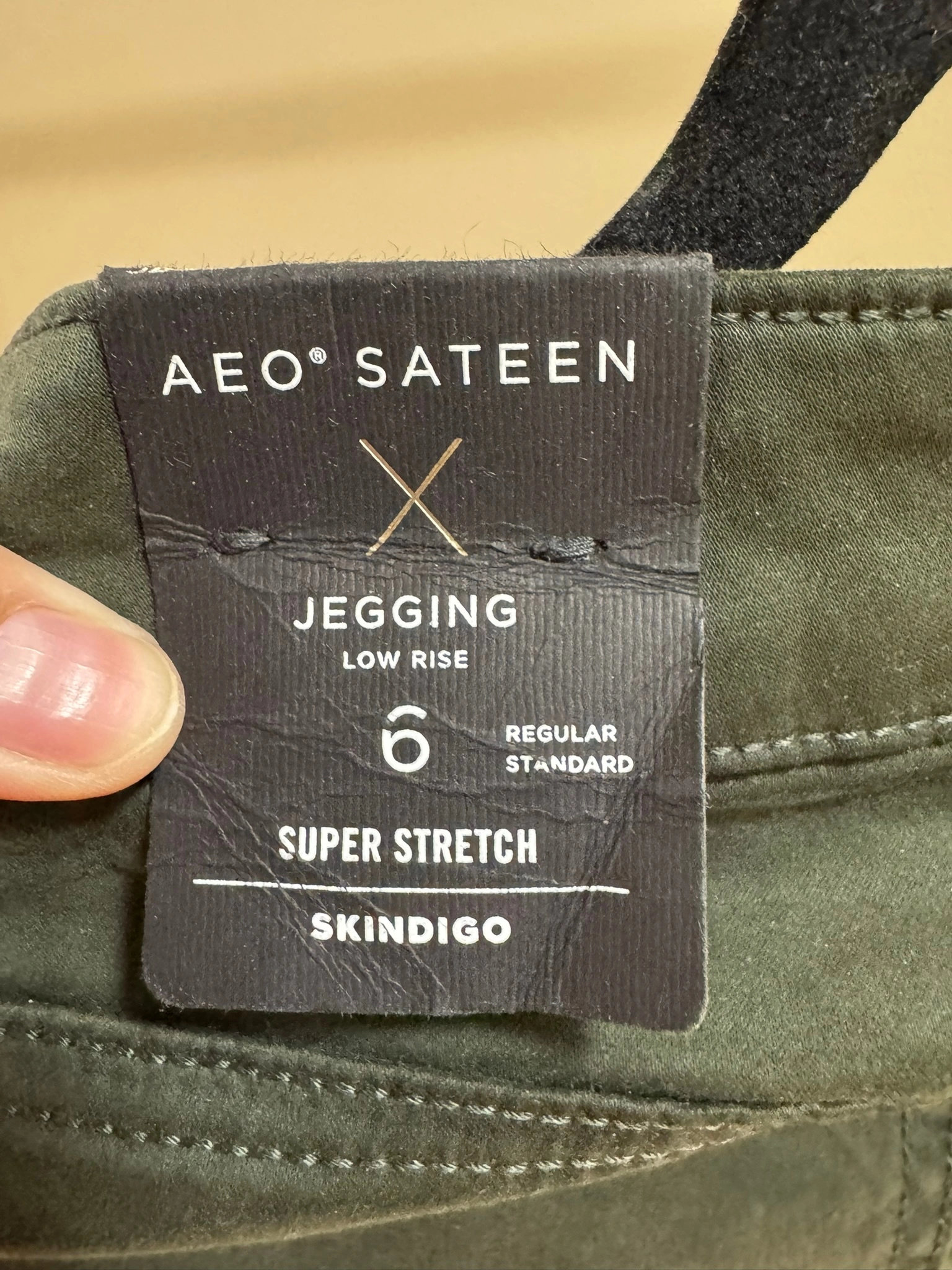 American Eagle Sateen X Jegging Size: 6 Regular (low rise) Color: Green Super Stretch fabric for a comfortable fit Soft sateen finish with a flattering skinny/jegging cut Gently worn, in excellent condition $40 OBO We can arrange for a pick-up from Buy and Sell Safe Exchange Zones (ex. 21 Division - near Bramalea City Centre in Brampton).