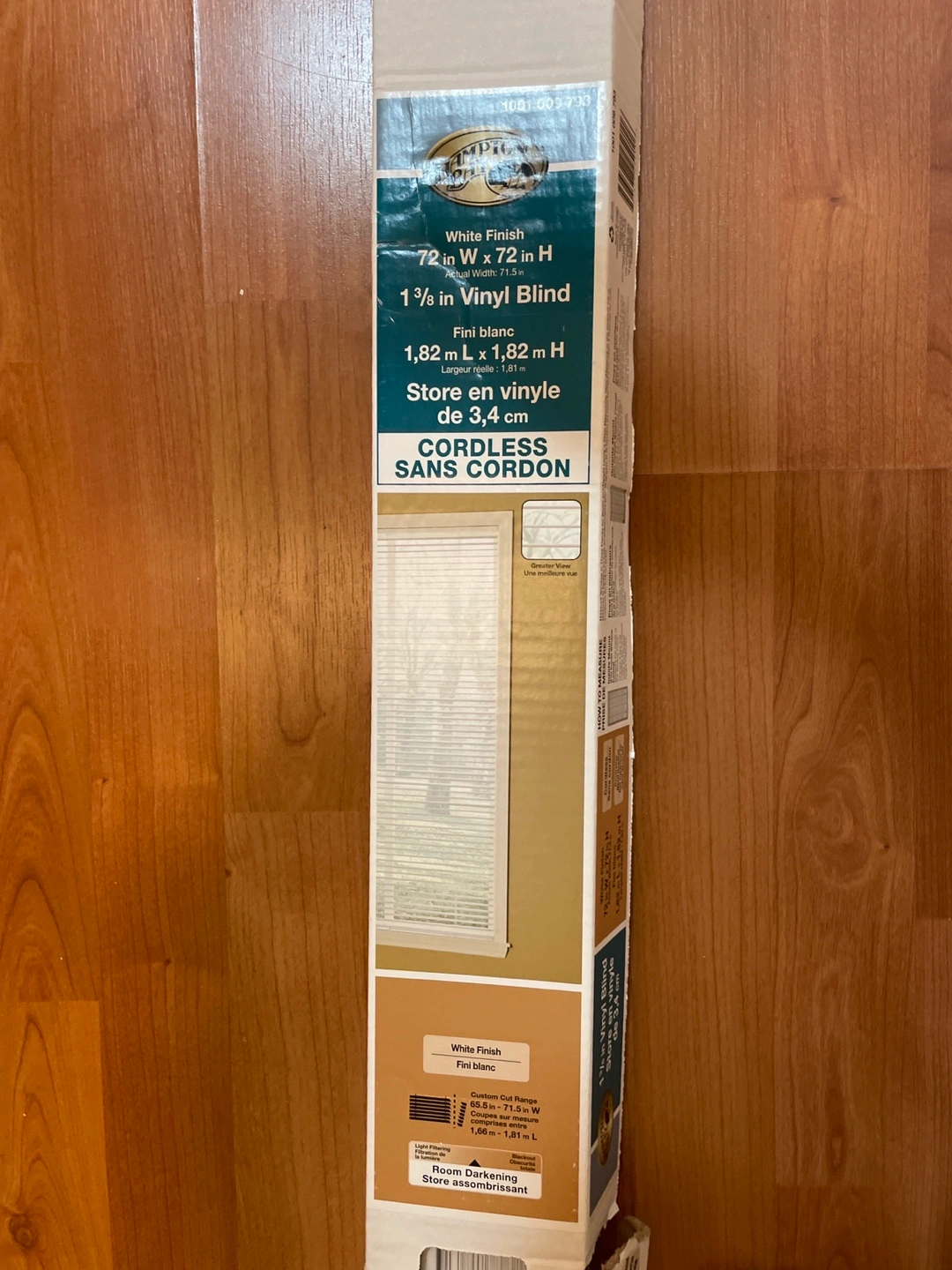 Selling a white finish Arctic White Cordless Vinyl Blind. It measures 72 inches in width and 72 inches in height. Minor scratch in picture 4. This blind is an old version with string. Too wide to install it. Pick up only Cash only.