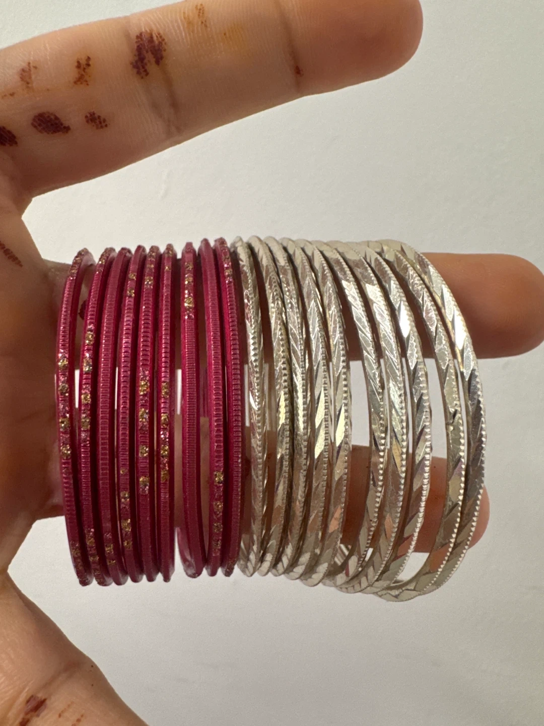Selling a set of 20 bangles! These include a mix of pink and silver colours. They're perfect for adding a touch of sparkle to any outfit. Great for parties or everyday wear! They are in good condition. Most probably girl with age 5-7 would fit