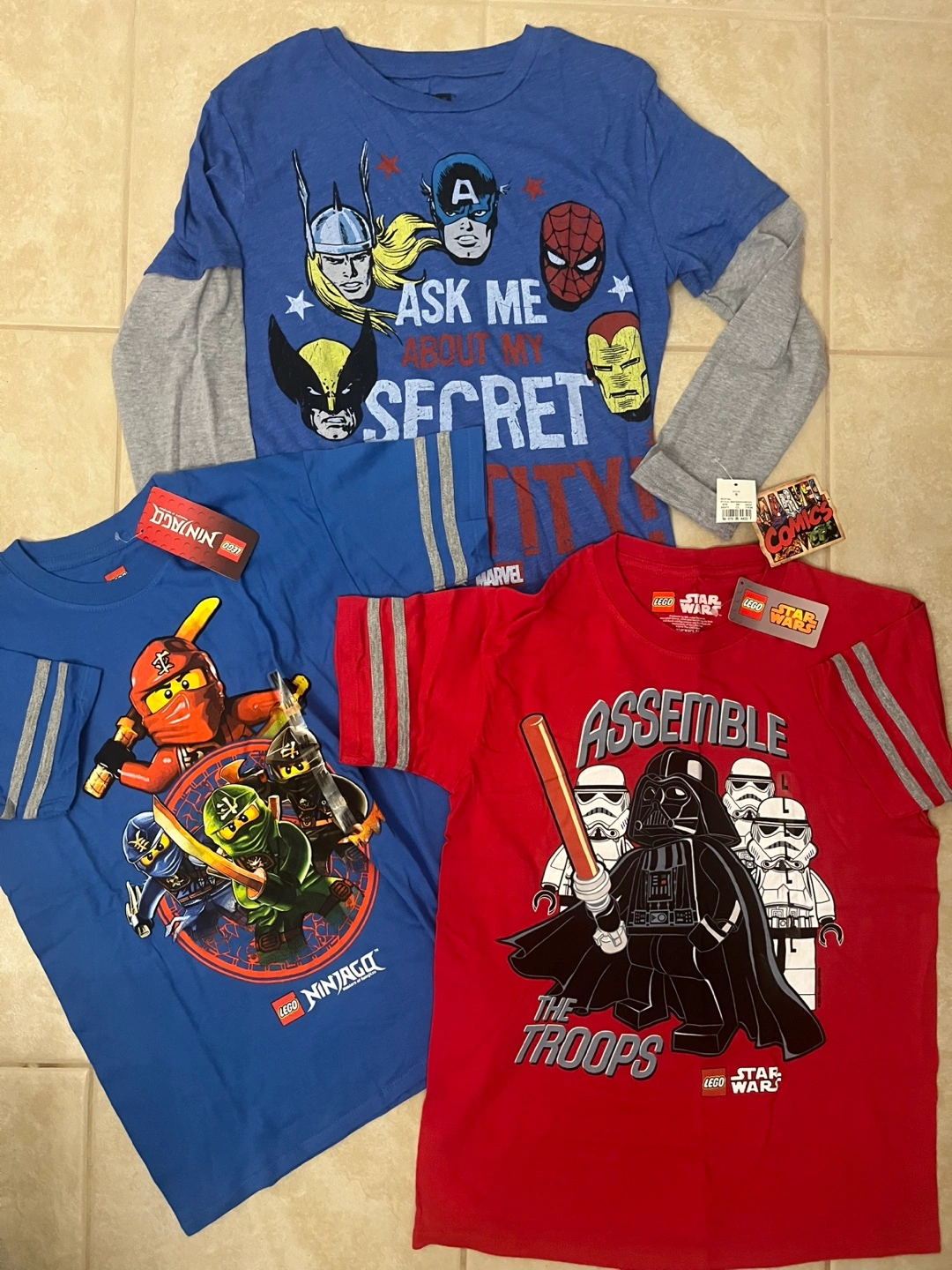 Selling a bundle of brand new Marvel & Lego t-shirts! There is one Marvel Comics tee Kids size Small, Lego Ninjago Kids size Medium & a Lego Star Wars Kids size Large. Perfect for any superhero or Lego fan! $10 each or Best Offer for all 3.