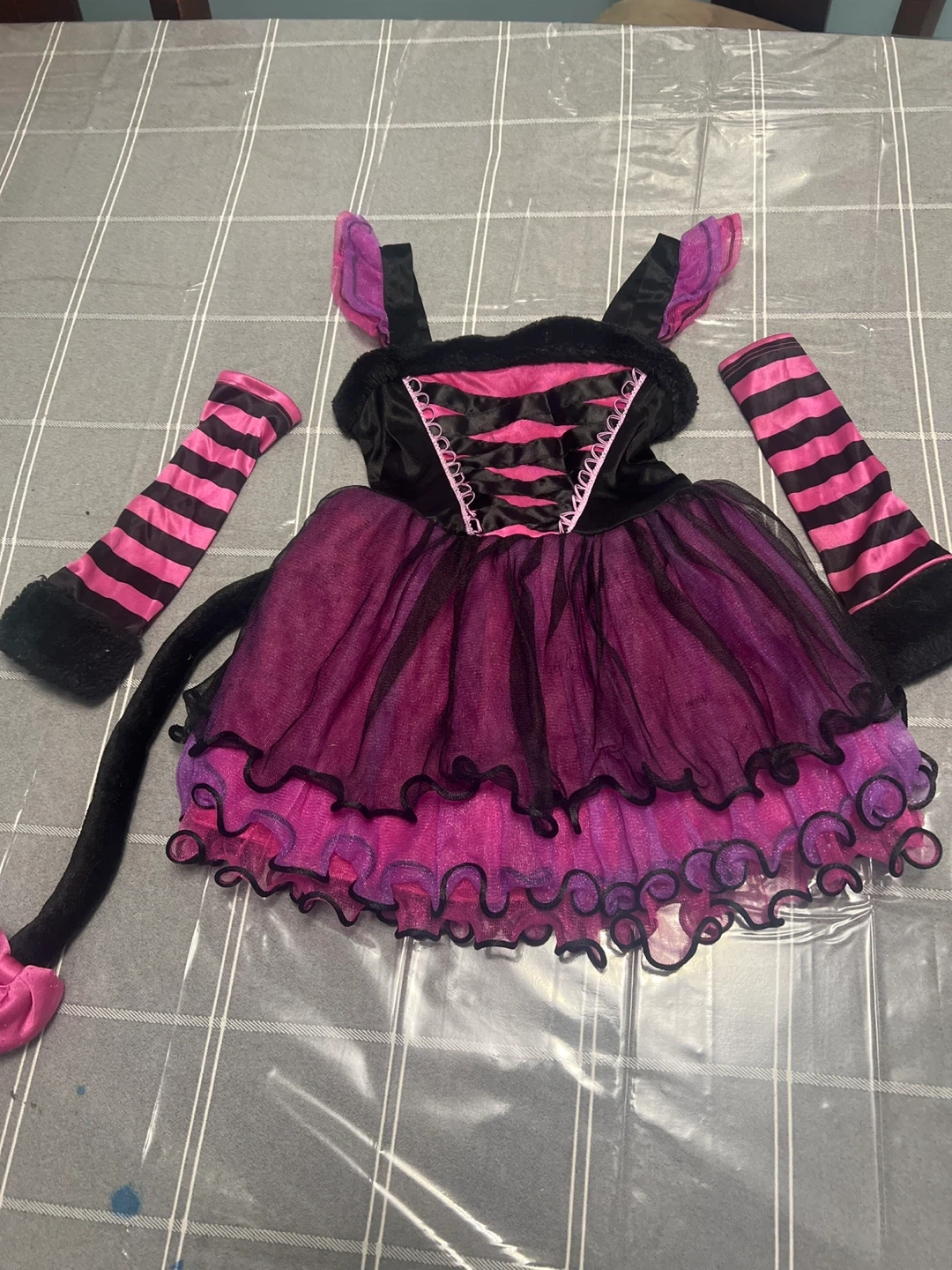 Cat costume includes a dress, tail, and arm warmers. The dress is black and purple with a tulle skirt. The arm warmers are pink and black striped. Perfect for Halloween or dress-up!