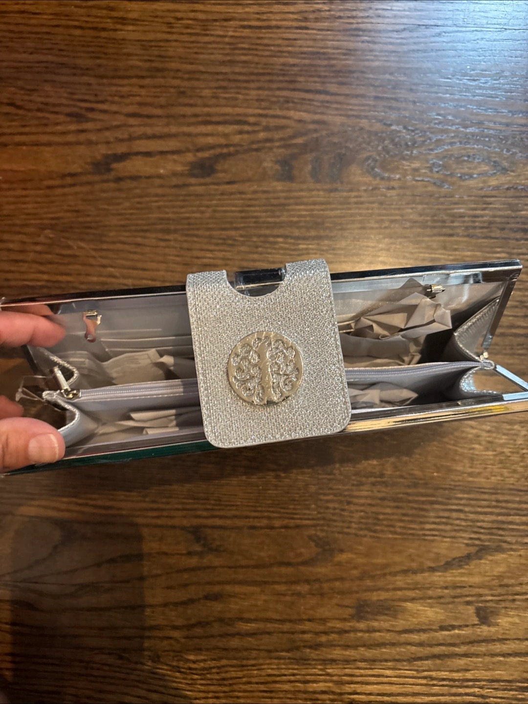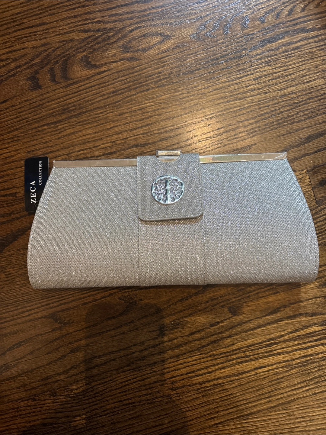 This is a lovely silver clutch purse from ZECA Collection! It is in great condition and perfect for evenings out or special occasions. It has a clasp closure and a sparkly finish that catches the light beautifully. Inside, there's plenty of room for your essentials!