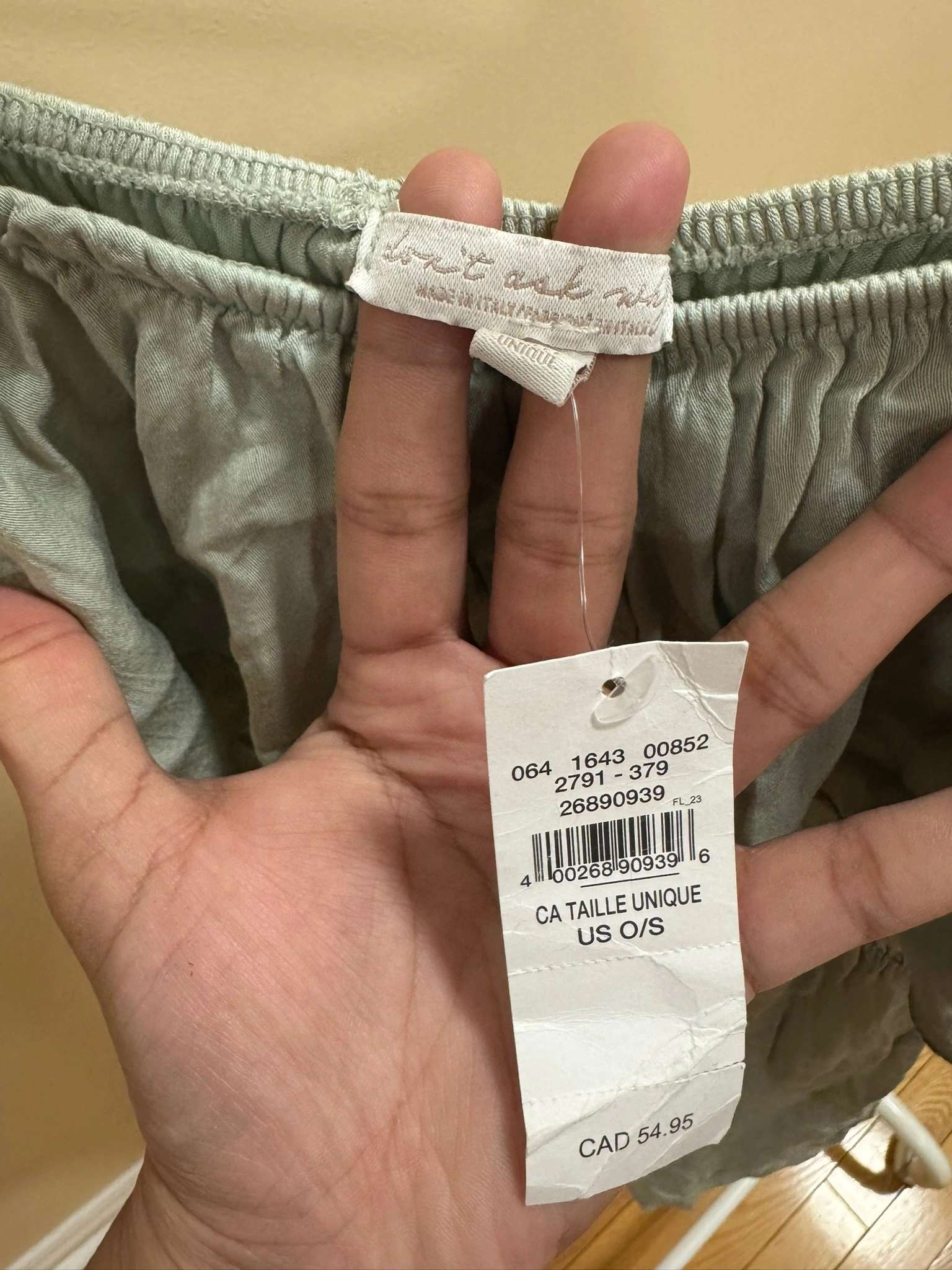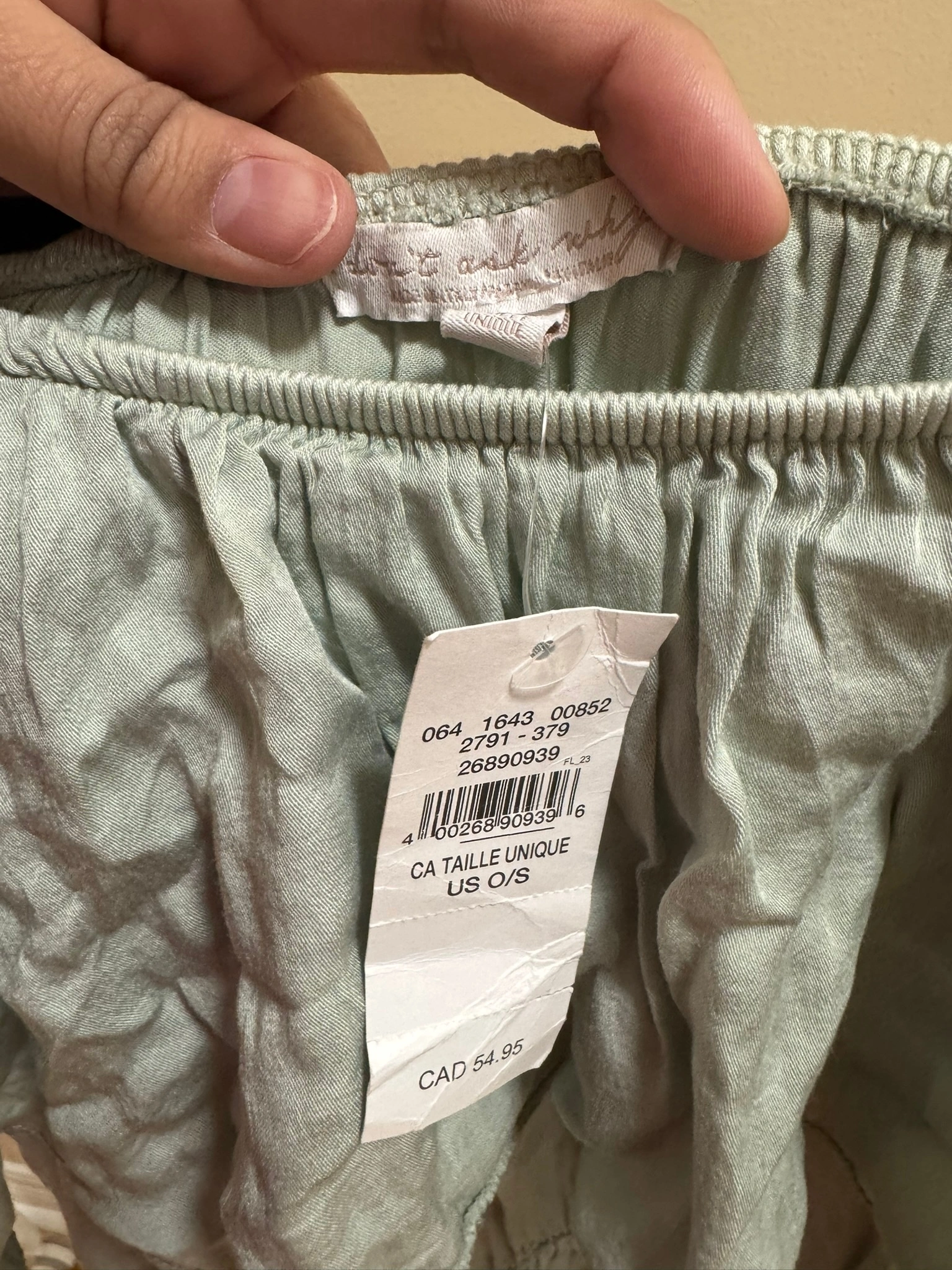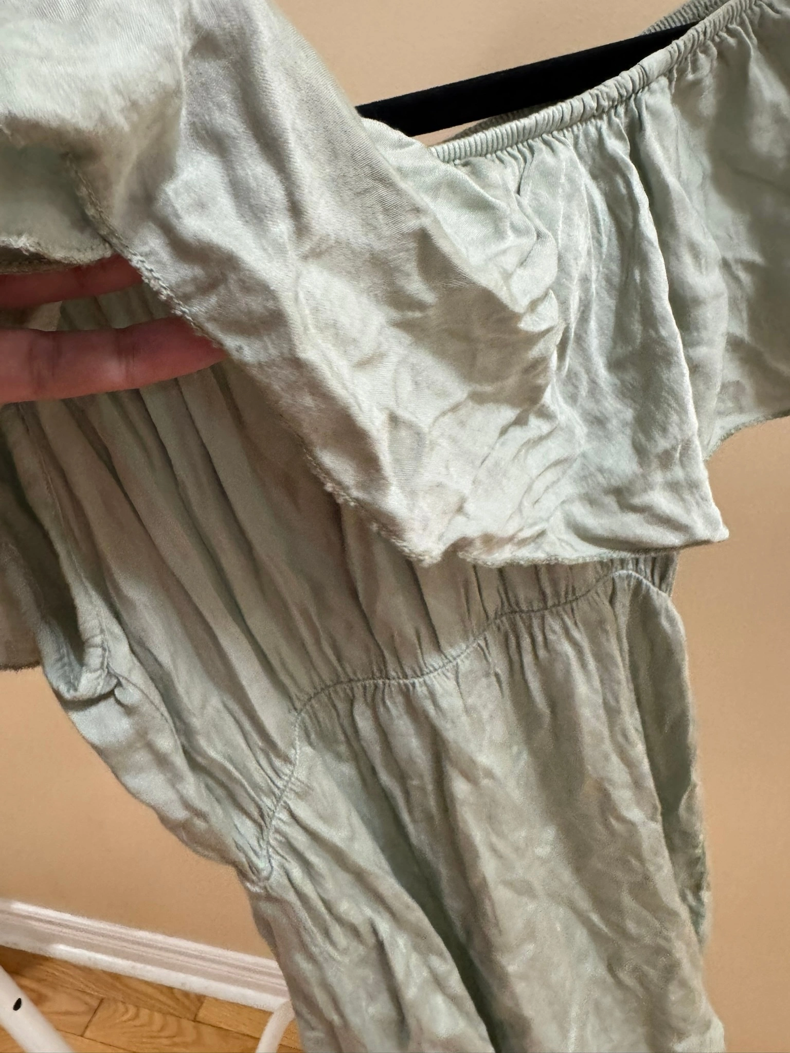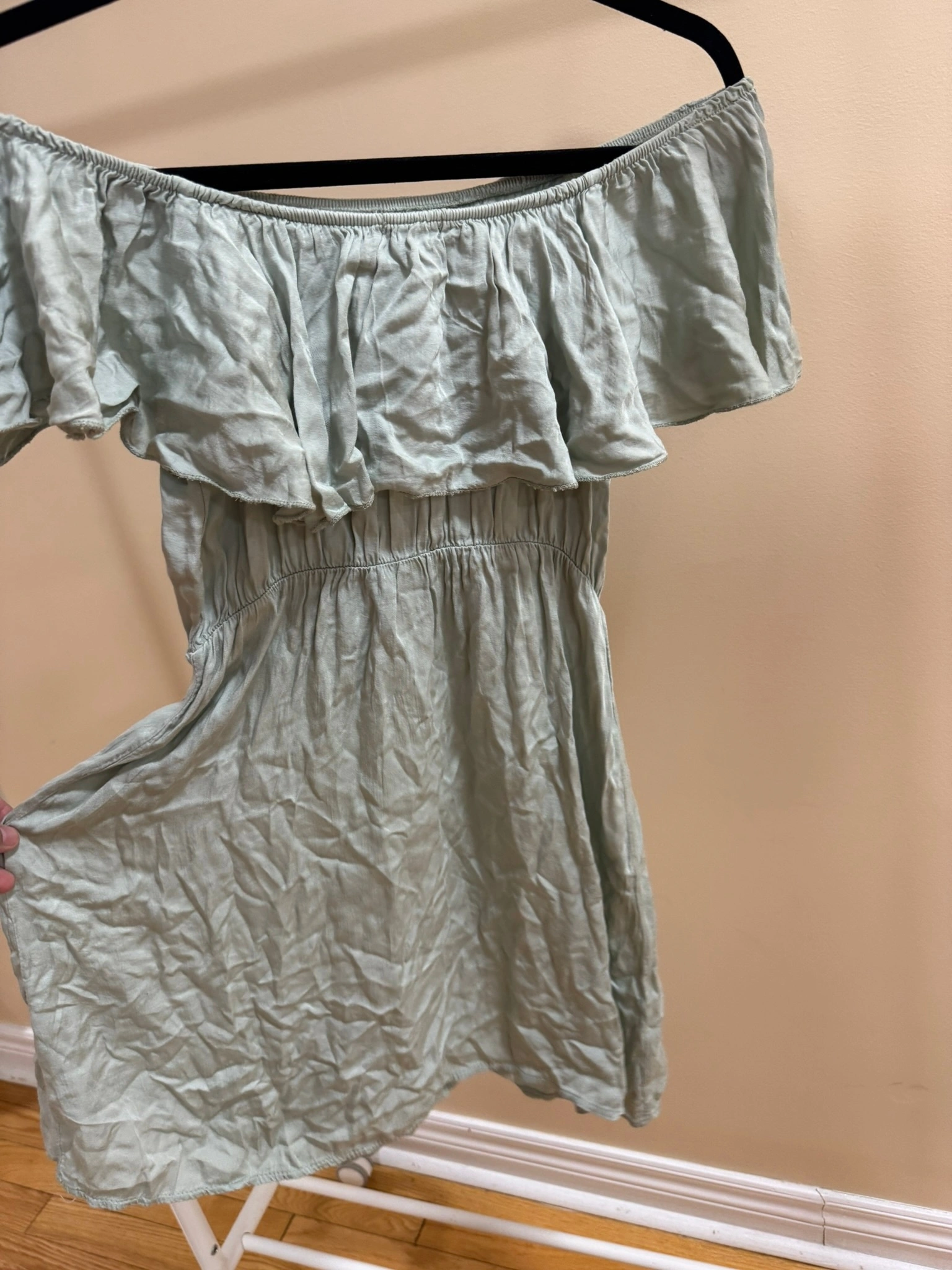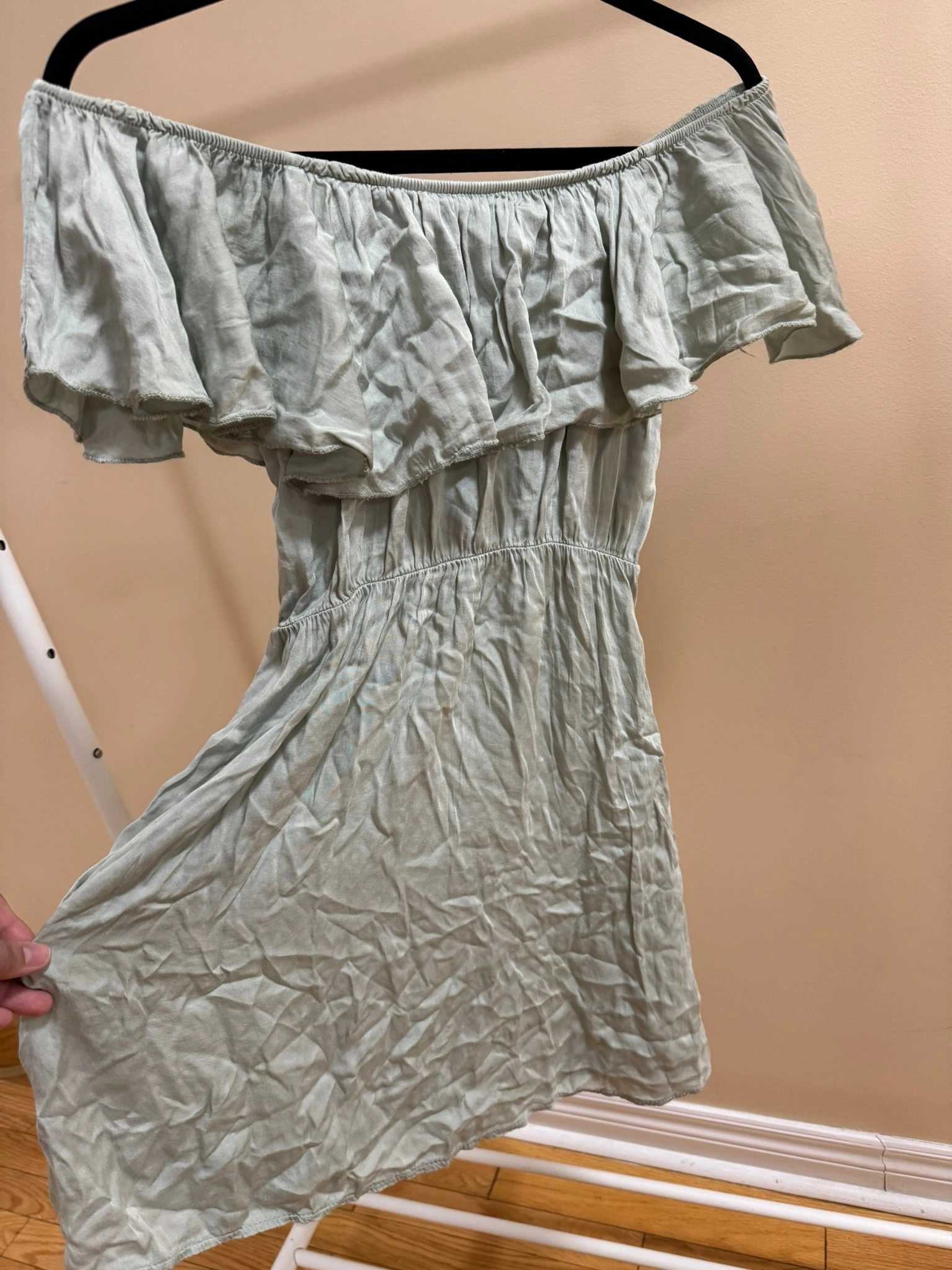 Brand new with tags! Beautiful sage green off-shoulder dress with romantic ruffle detail at the neckline. Features an elastic waist for a flattering fit and flowy silhouette. Perfect for summer events, date nights, or casual outings. $40 OBO We can arrange for a pick-up from Buy and Sell Safe Exchange Zones (ex. 21 Division - near Bramalea City Centre in Brampton).
