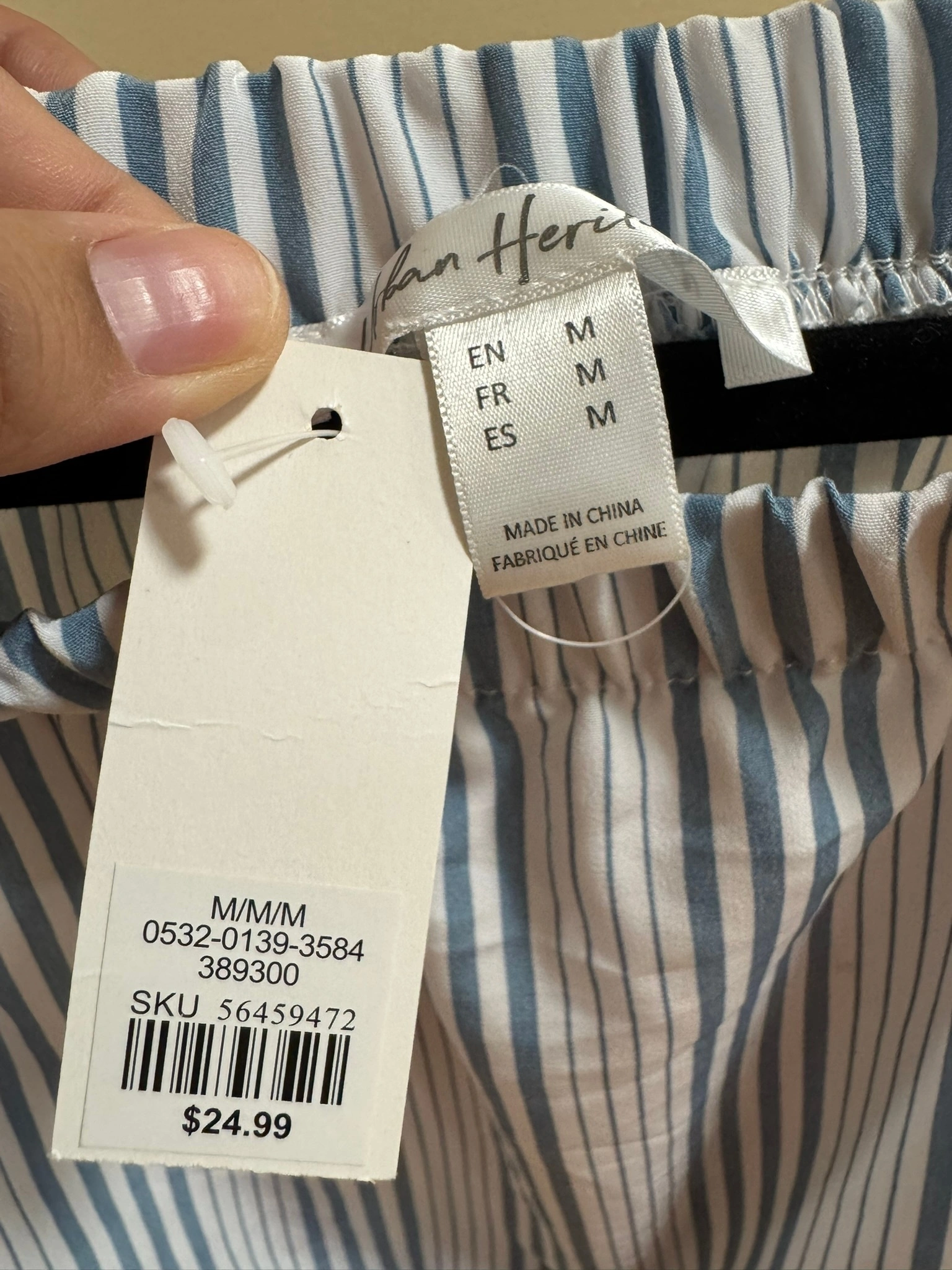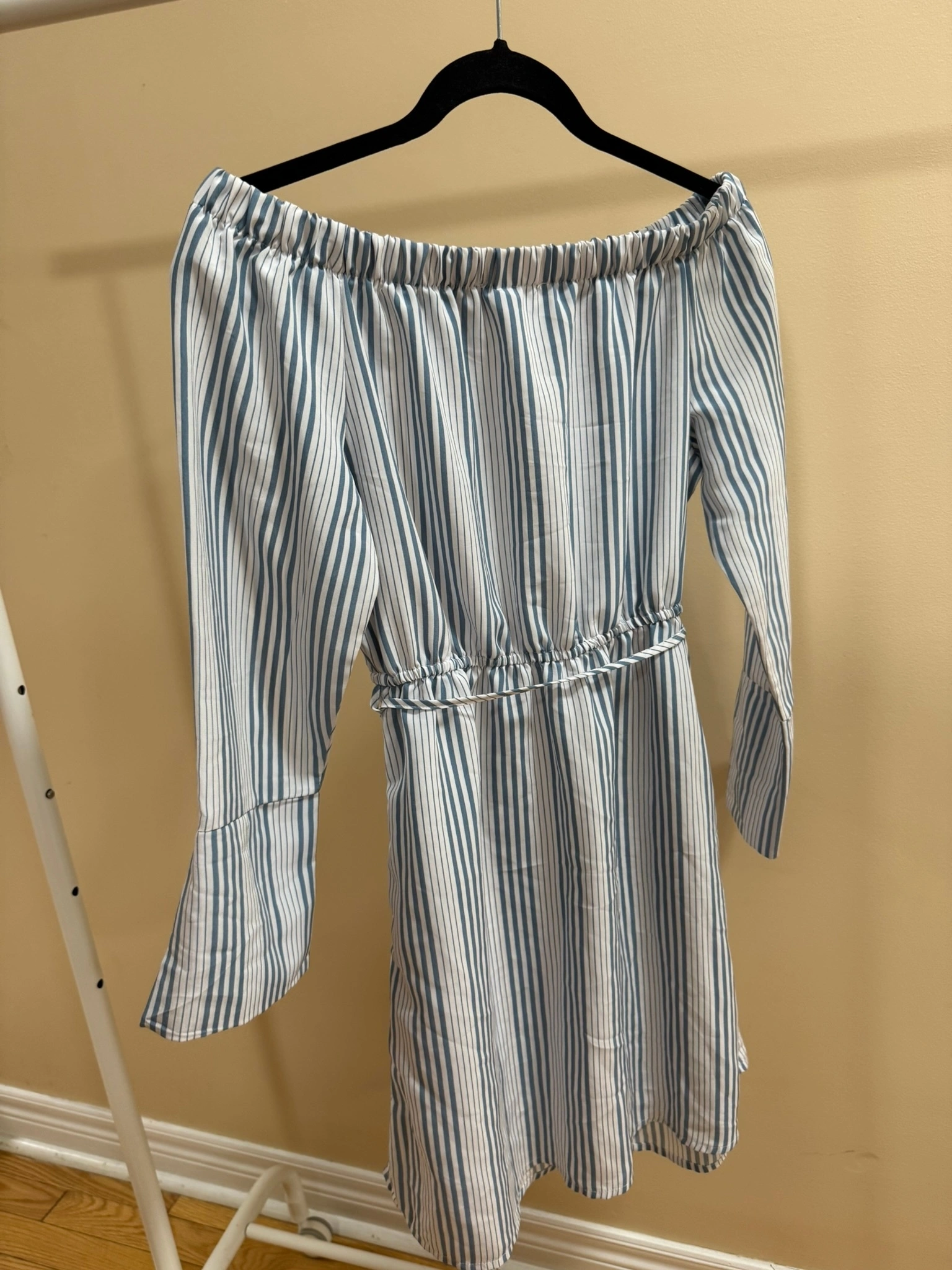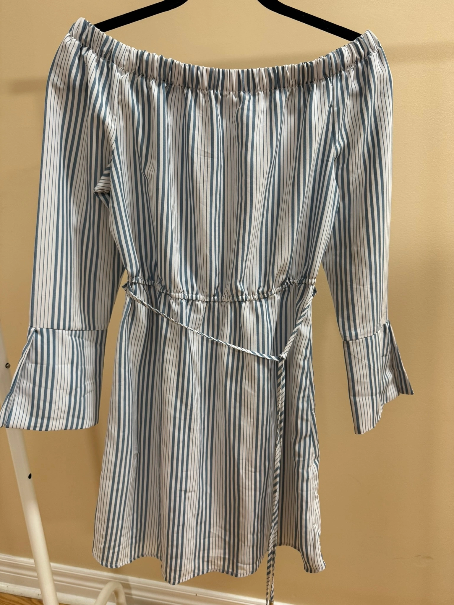 Brand new with tags striped dress from Jan Henri. Features: Off-the-shoulder neckline with elastic band Blue and white vertical stripes 3/4 sleeves with bell cuffs Tie belt at waist for flattering silhouette Never worn, perfect condition