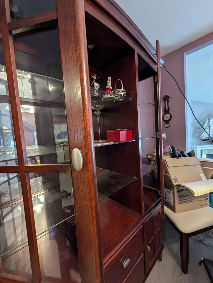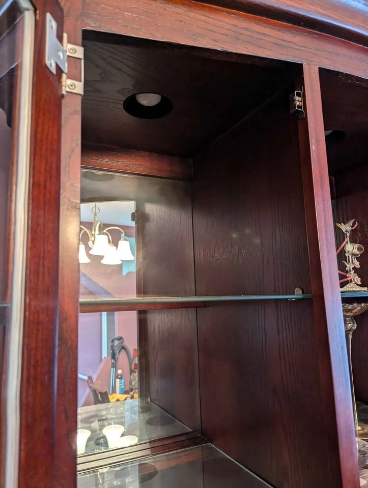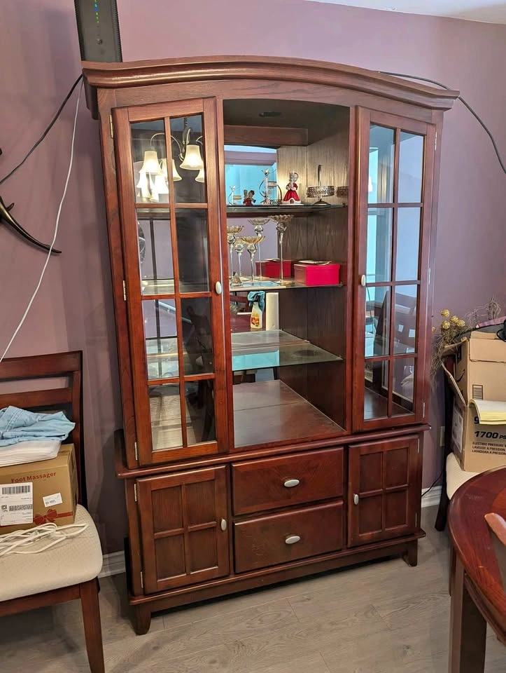This China cabinet/ hutch is in prime condition. It features glass shelves and overhead interior lighting. It is a two piece solid wood finish and very heavy.