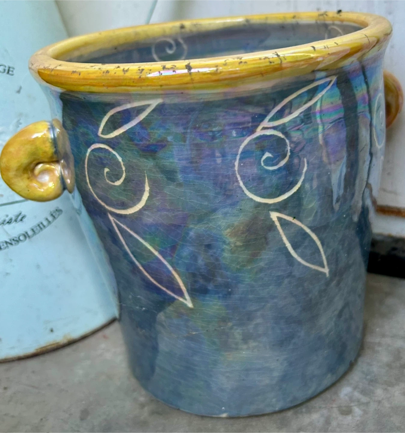 This is a lovely decorative ceramic flower pot. It features a unique design with a blue iridescent glaze and a yellow rim and handles. It has a nice weight and would be perfect for displaying your favourite plants or flowers in your home or garden. It adds a touch of charm to any space!