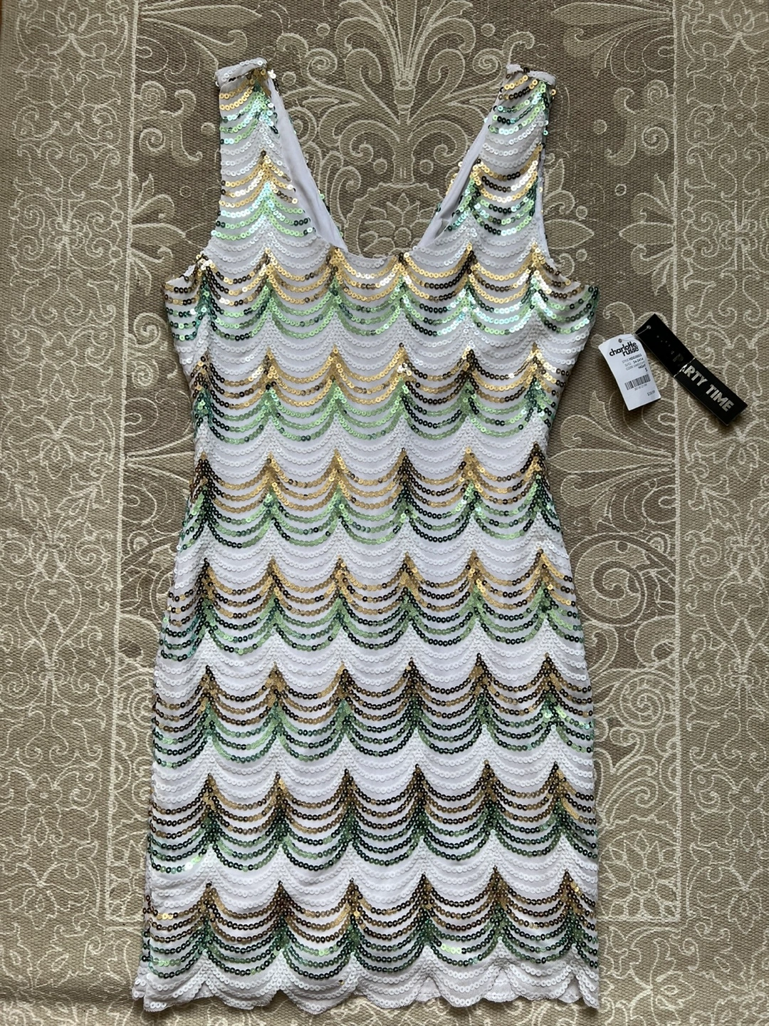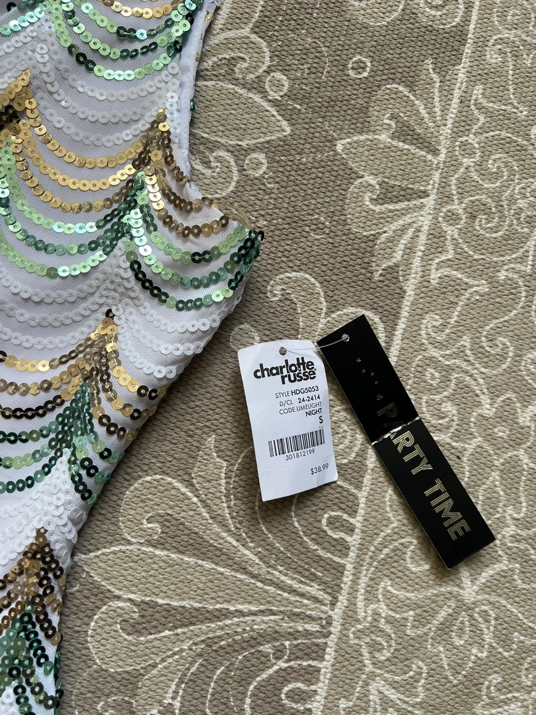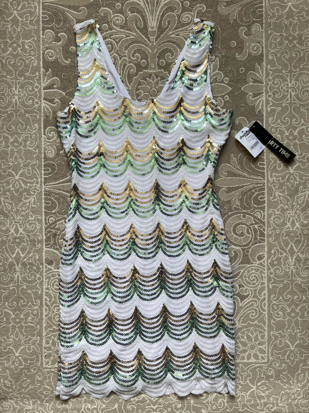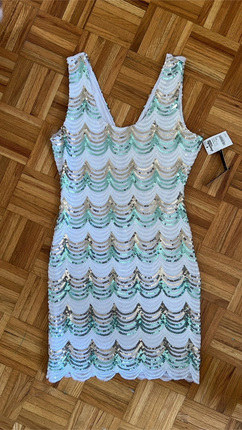This is a cute Charlotte Russe party dress! It's a size small and features a fun sequin design. The original price tag shows $38.99. Perfect for a night out!
