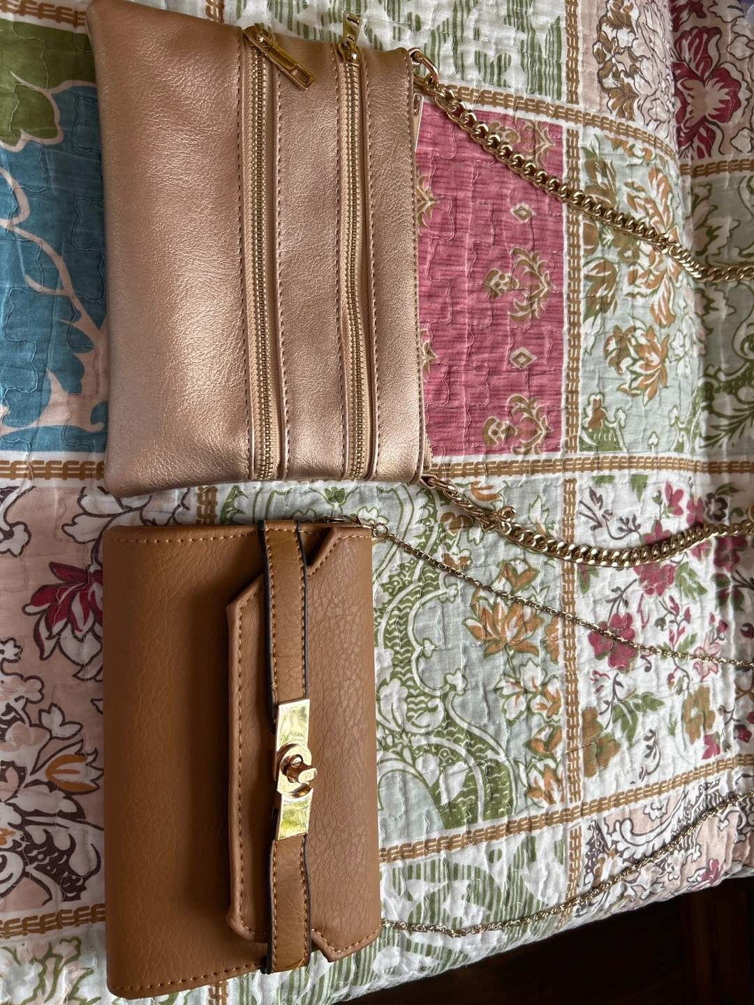 Selling two small purses. Each $5. One is a light gold colour with three zippers and a chain strap. The other is a tan colour with a gold clasp and chain strap. Both are in good condition!