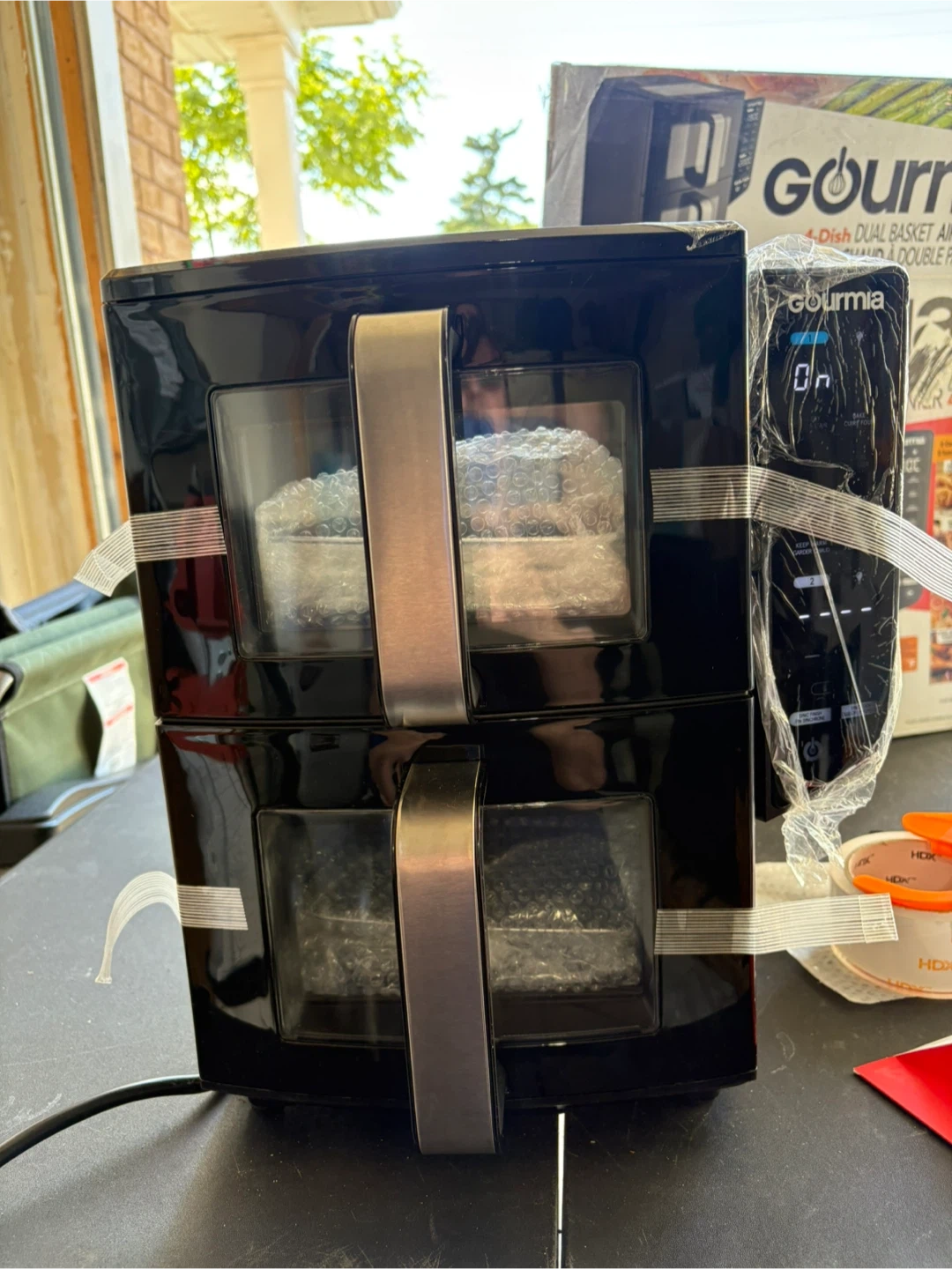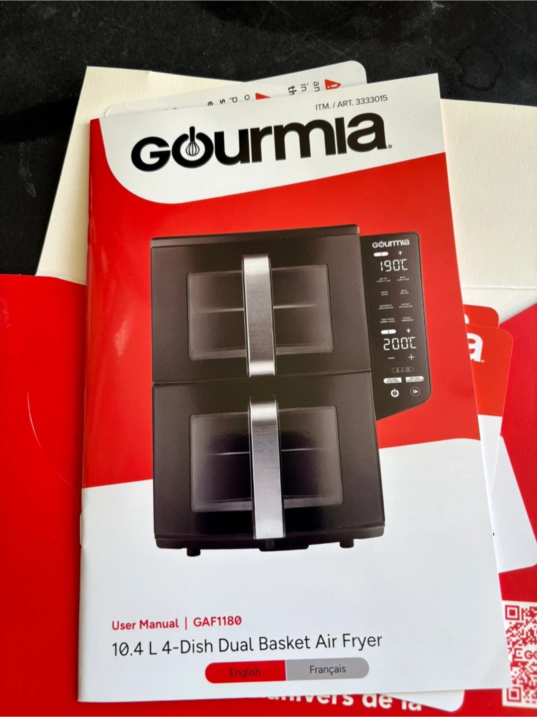 Brand new Gourmia 4 Dish Dual Basket Air Fryer (Model GAF1180). • Large 10.4L capacity (two 5.2L baskets) • 8 one-touch cooking functions • FryForce 360° Technology™ • Sync Cook & Sync Finish features • Viewing windows with interior light • Comes in original box with manual Final Price – No Negotiation
