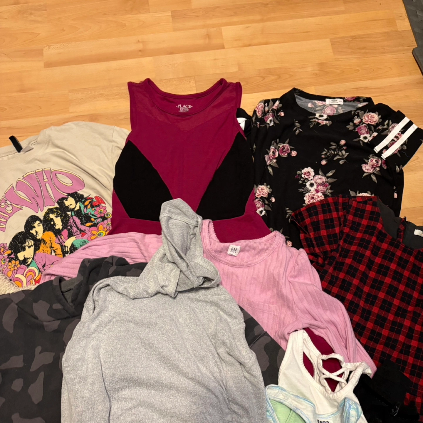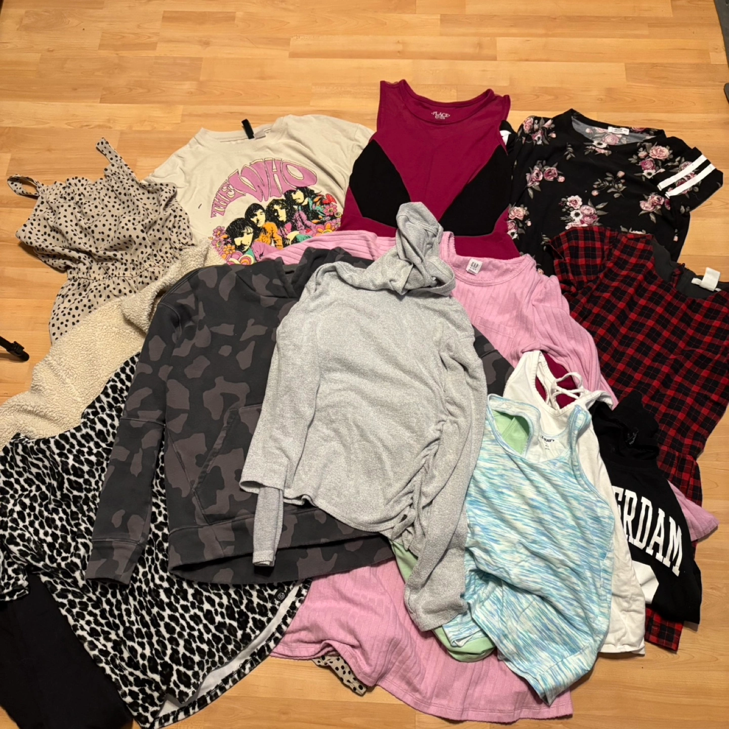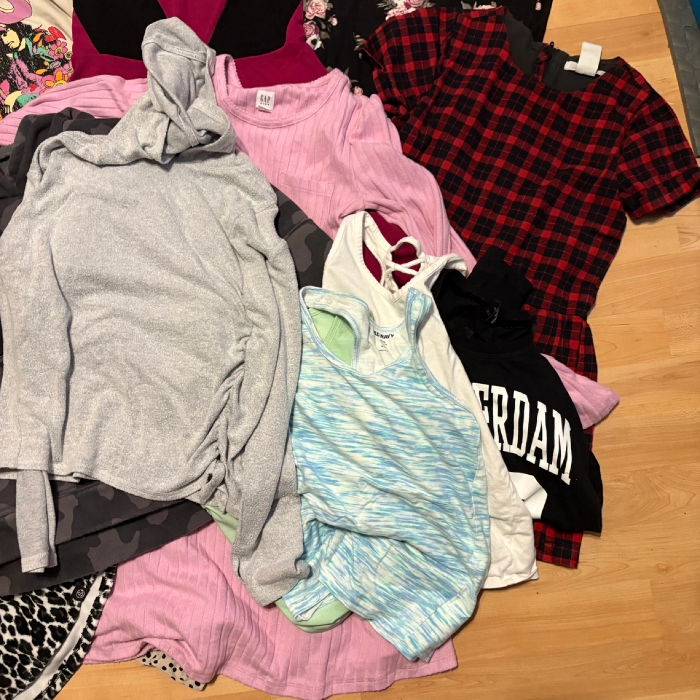 A mixed bundle of clothing items. Includes brands such as GAP, Old Navy, and The Children's Place. Various sizes and styles, perfect for a wardrobe refresh! Price for all. Pick up only.